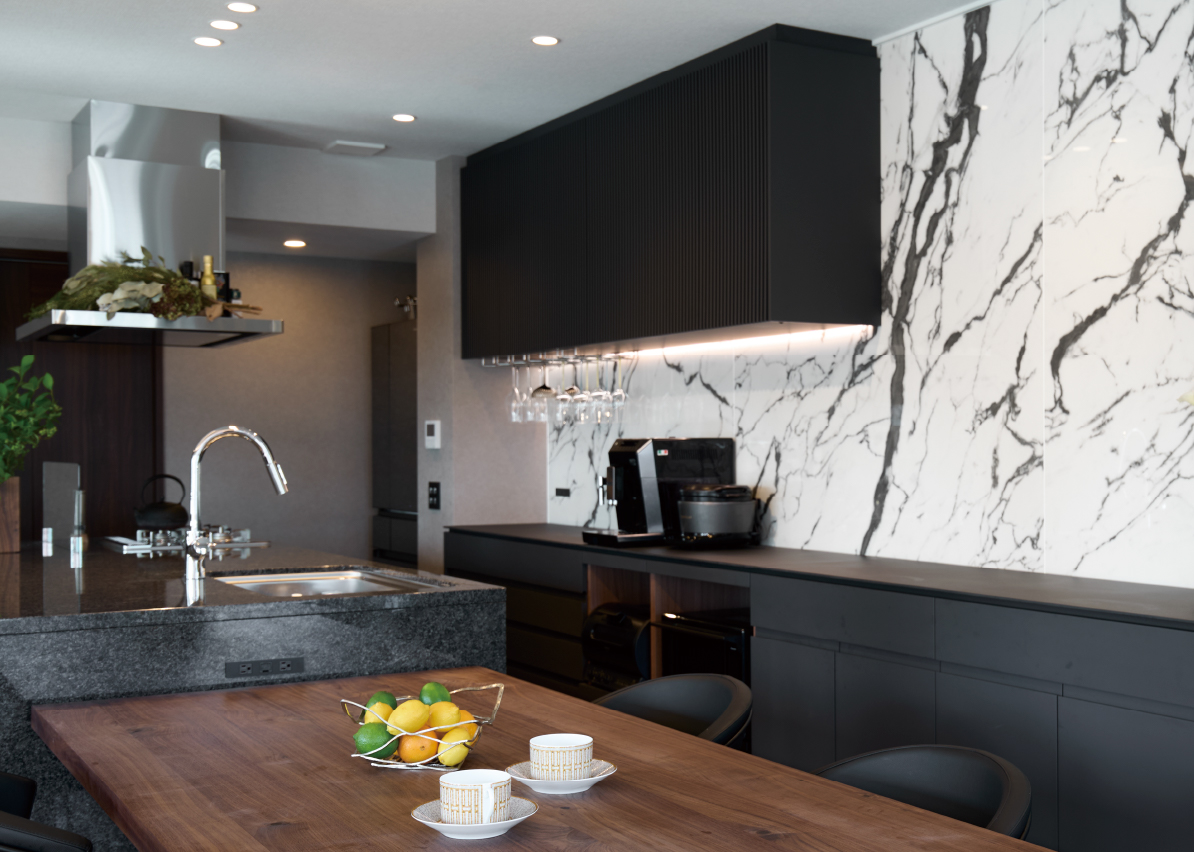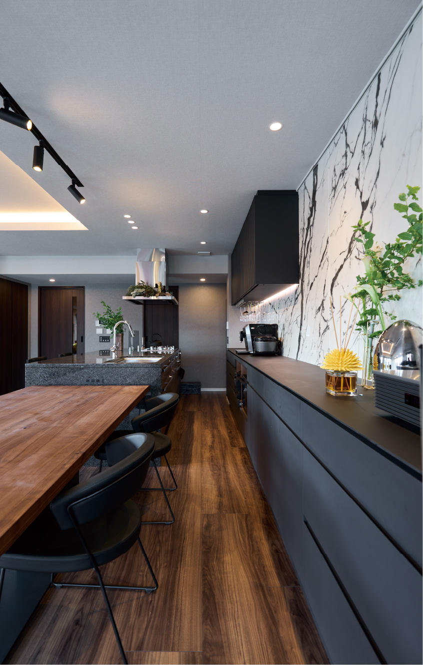 「少し迷ったのは、ダイニングキッチン側の壁の仕上げです。面積が広いので飽きのこないデザインが良いかなと思ったのですが、おもてなしをする空間でもあるので、お客様に素敵だね、と喜んでもらいたい気持ちもあって、光沢のある華やかなものを選びました。造作収納がマット系で落ち着いているので、全体としてはちょうど良いバランスになったのではないかと思います」(ご主人)
