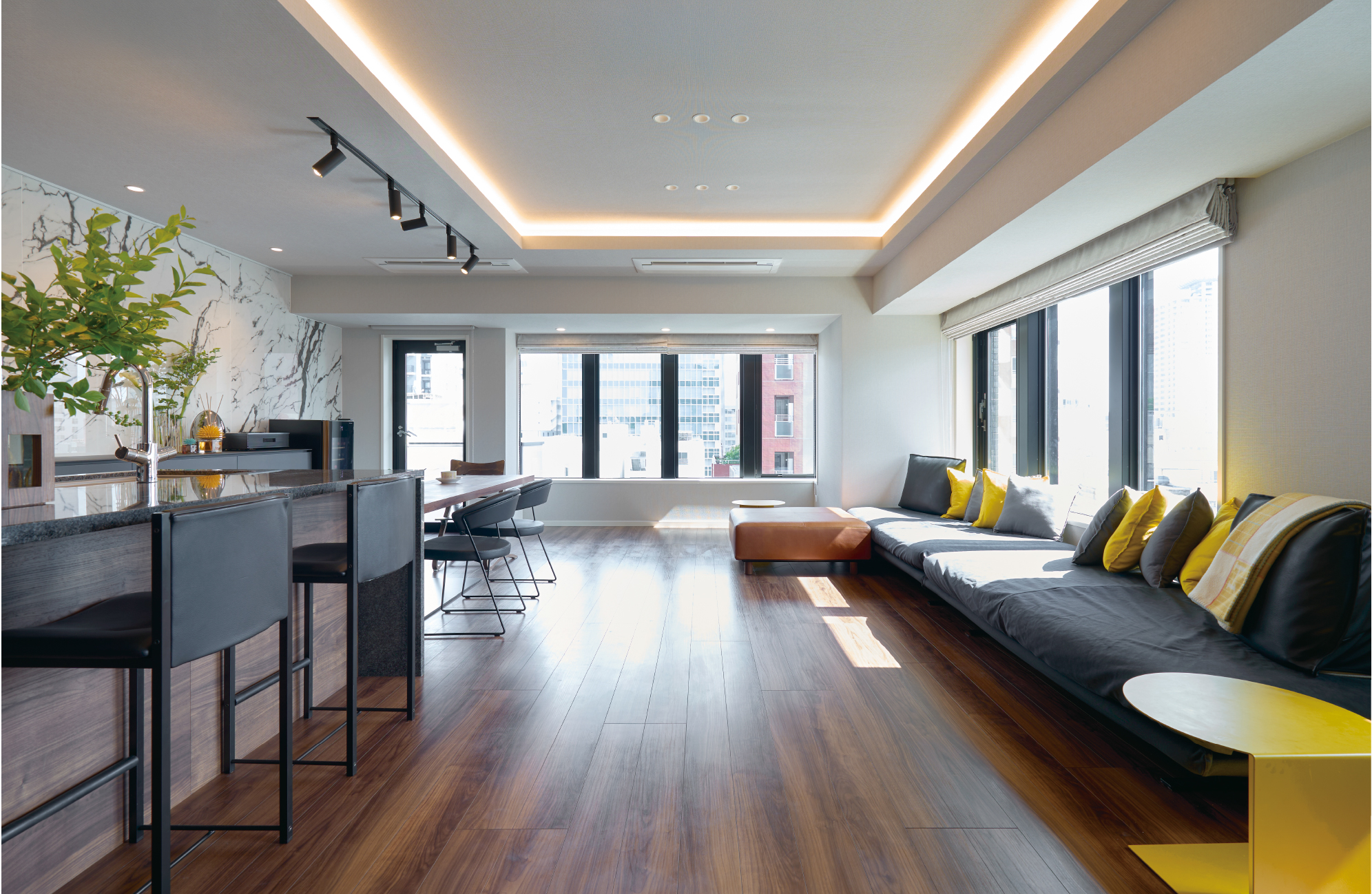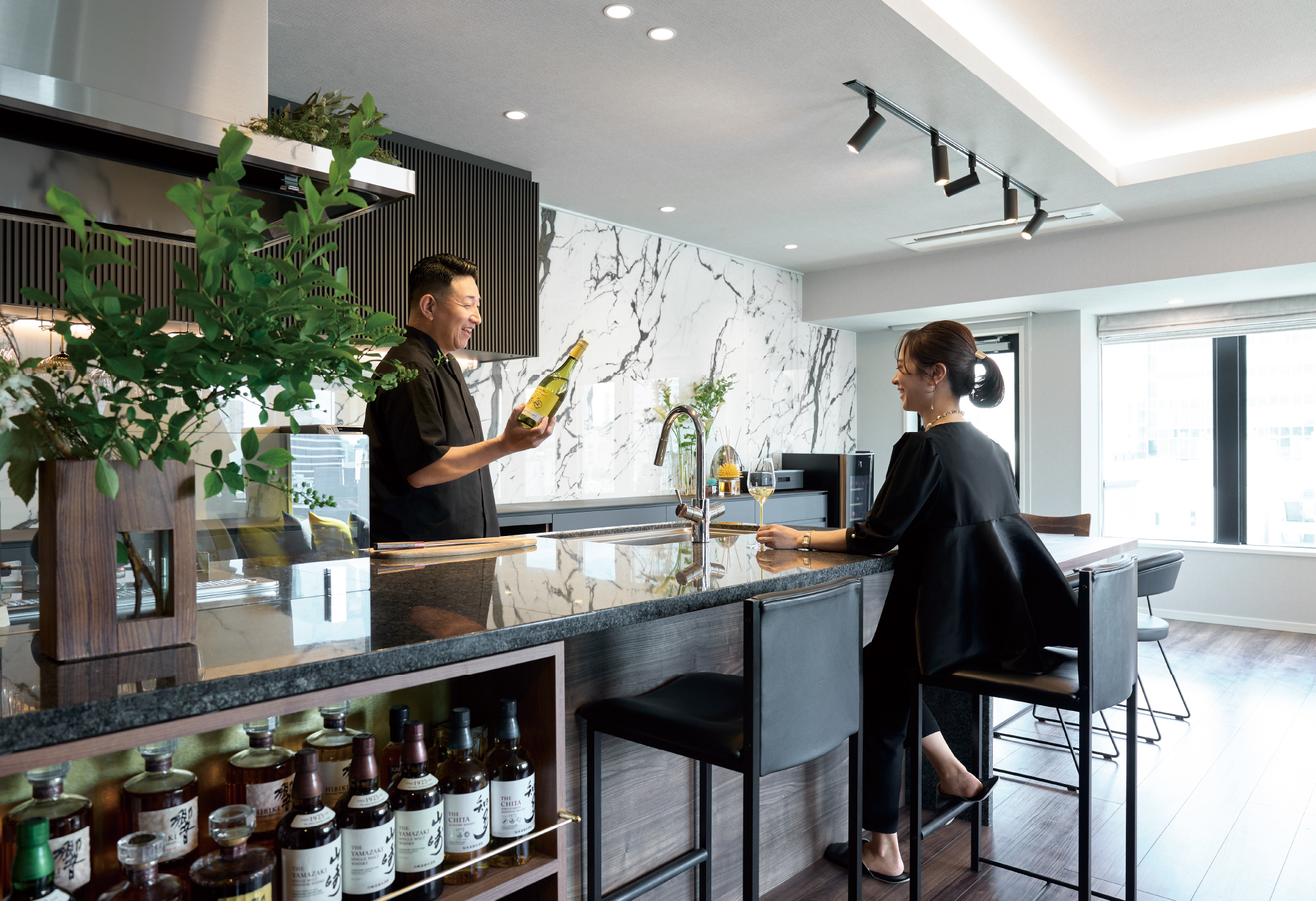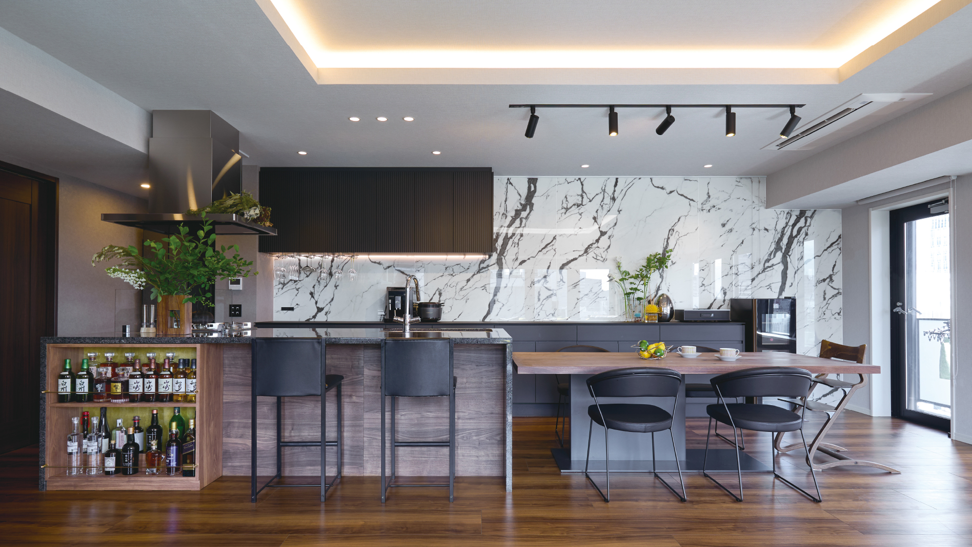 自分たちだけでなく、お客様にも楽しんでほしいという想いで設えた、大人の隠れ家のようなLDK。
