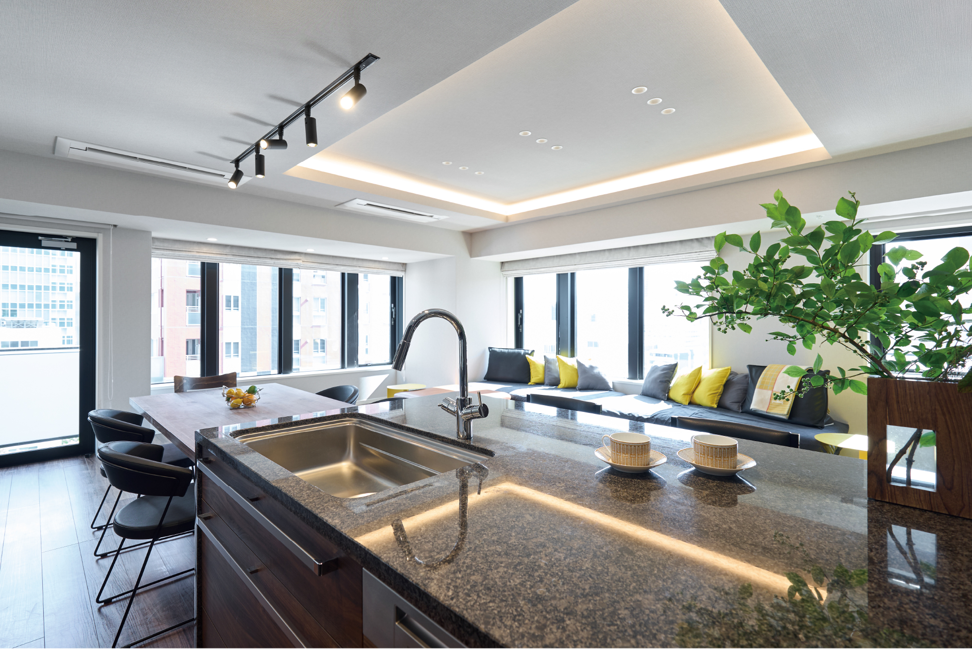 そんな空間のポテンシャルを最大限に引き出しているのが、じっくり時間をかけて仕上げられた、こだわりのインテリアです。空間デザインが趣味のひとつというご主人が3Dシミュレーションを行なって、家具の配置をはじめ、造作収納の仕様、間接照明の配灯、仕上げ材の材質や配色まで、細かく決めていったとのこと。
