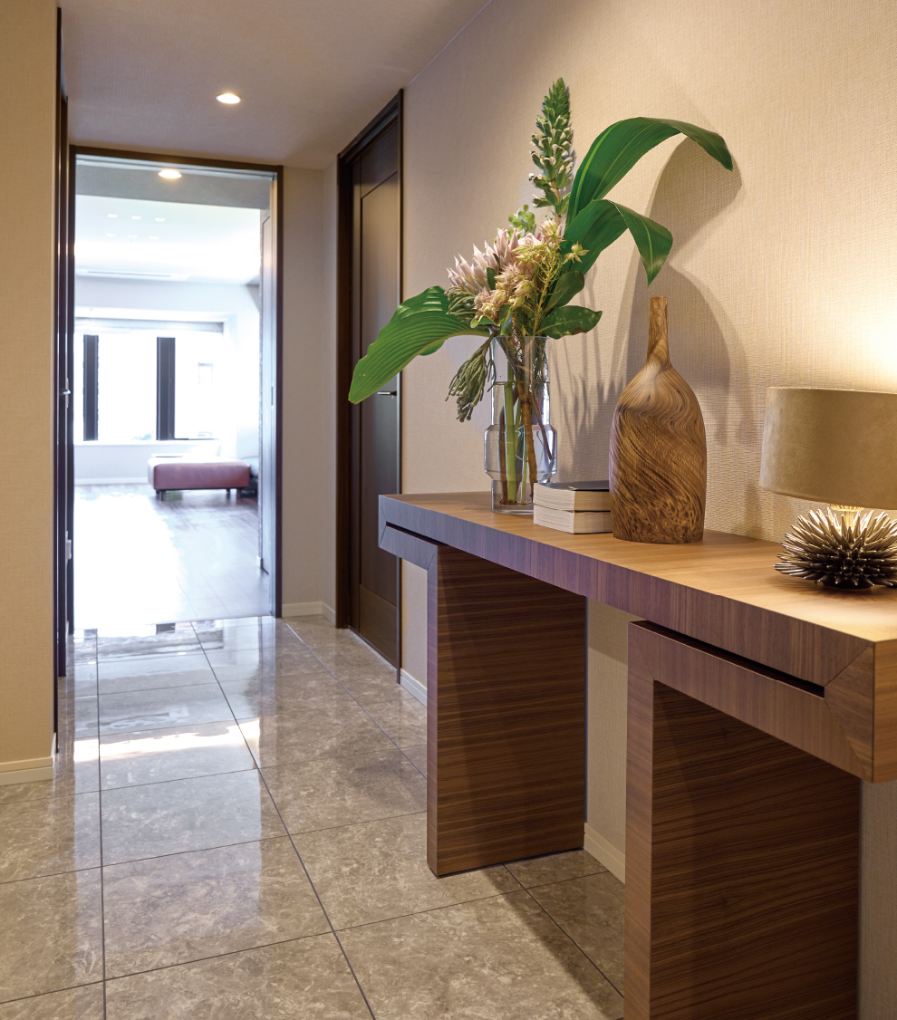 地下鉄の3駅からそれぞれ徒歩5~6分、名古屋駅からも徒歩11分という好立地の「グランドメゾン伏見」。T様邸は2つの住戸を連結したゆとりのある間取りで、都心の住まいでは得難い広々としたLDKが大きな魅力です。