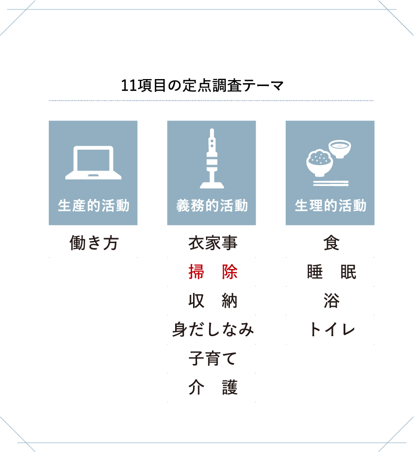 現在は11のテーマに対して10年ごとの調査を継続的に実施。暮らしの幸せの追求、〝住めば住むほど幸せ住まい〟研究の一環として取り組み続けています。