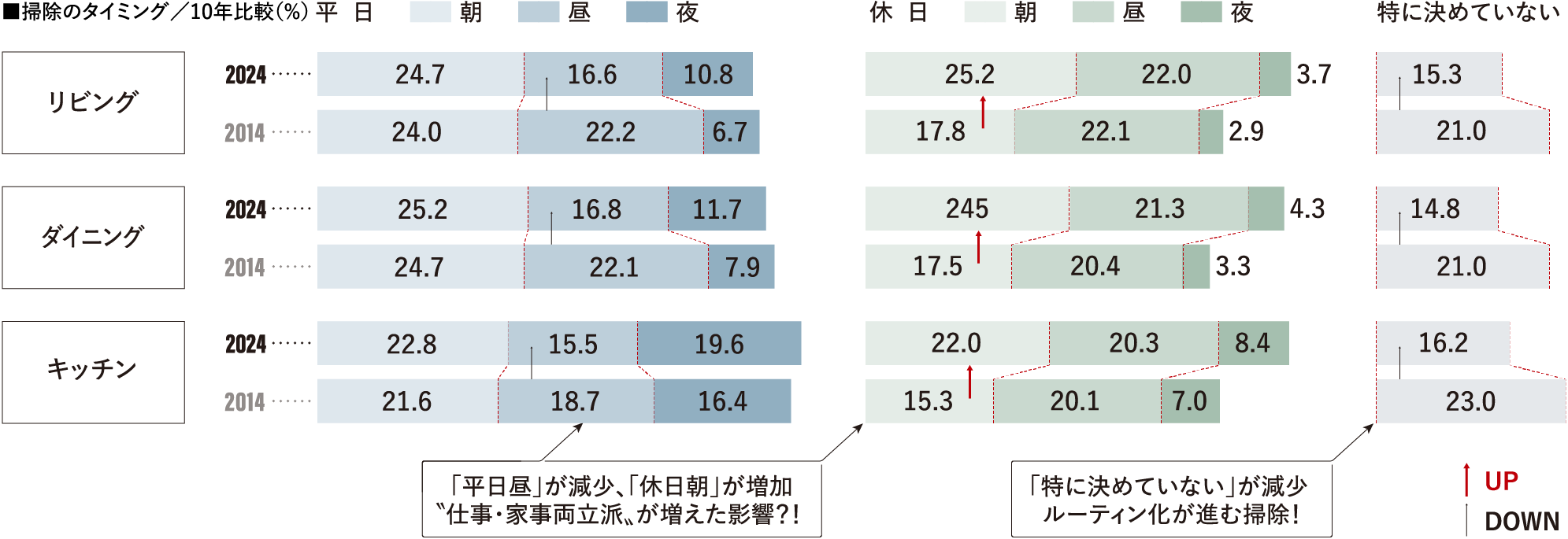 まずは掃除のタイミング。LDKの掃除で調査したところ、2014年では「平日朝」「平日昼」「休日昼」が上位3位でしたが、2024年には「平日昼」が減って「休日朝」に置き換わりました。これは共働きで仕事と家事を両立する家族が増えた影響と考えられます。