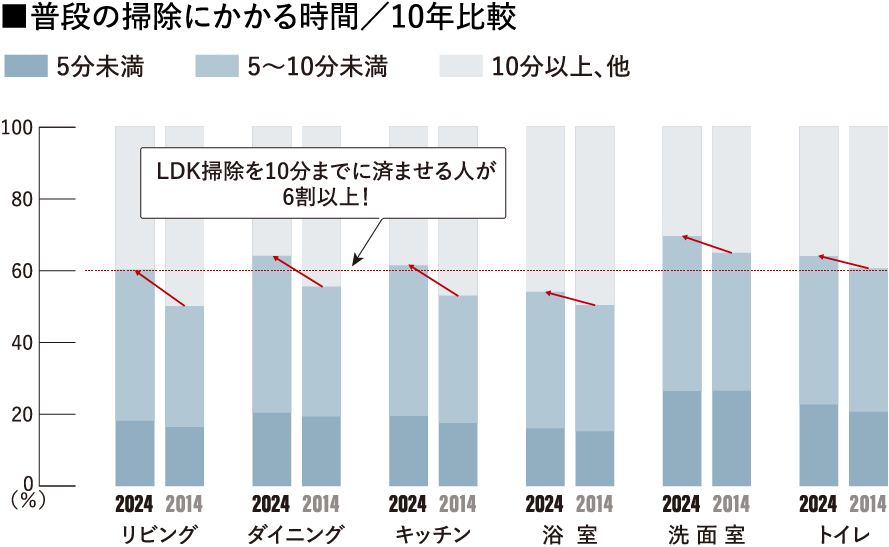まず掃除頻度が高くなり、週に2~3回以上掃除する人が増加。 さらに10分未満で掃除を済ませる人が6割以上に上っています。普段の掃除は〝こまめにサッと10分以内に〟というスタイルが主流になっています。