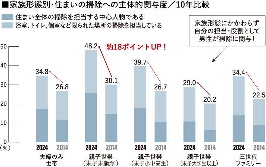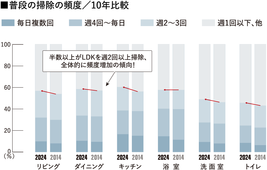 すでに2014年の時点で女性の社会参画は一般的でしたし、男性の家事参加や家族での家事分担の兆しはありました。そして10年を経た2024年、その考え方がさらに広まり〝みんなで家事〟の生活スタイルの定着が進んでいます。今回の生活定点調査〈掃除編〉でも男性家事参加の傾向が顕著に表れました。
