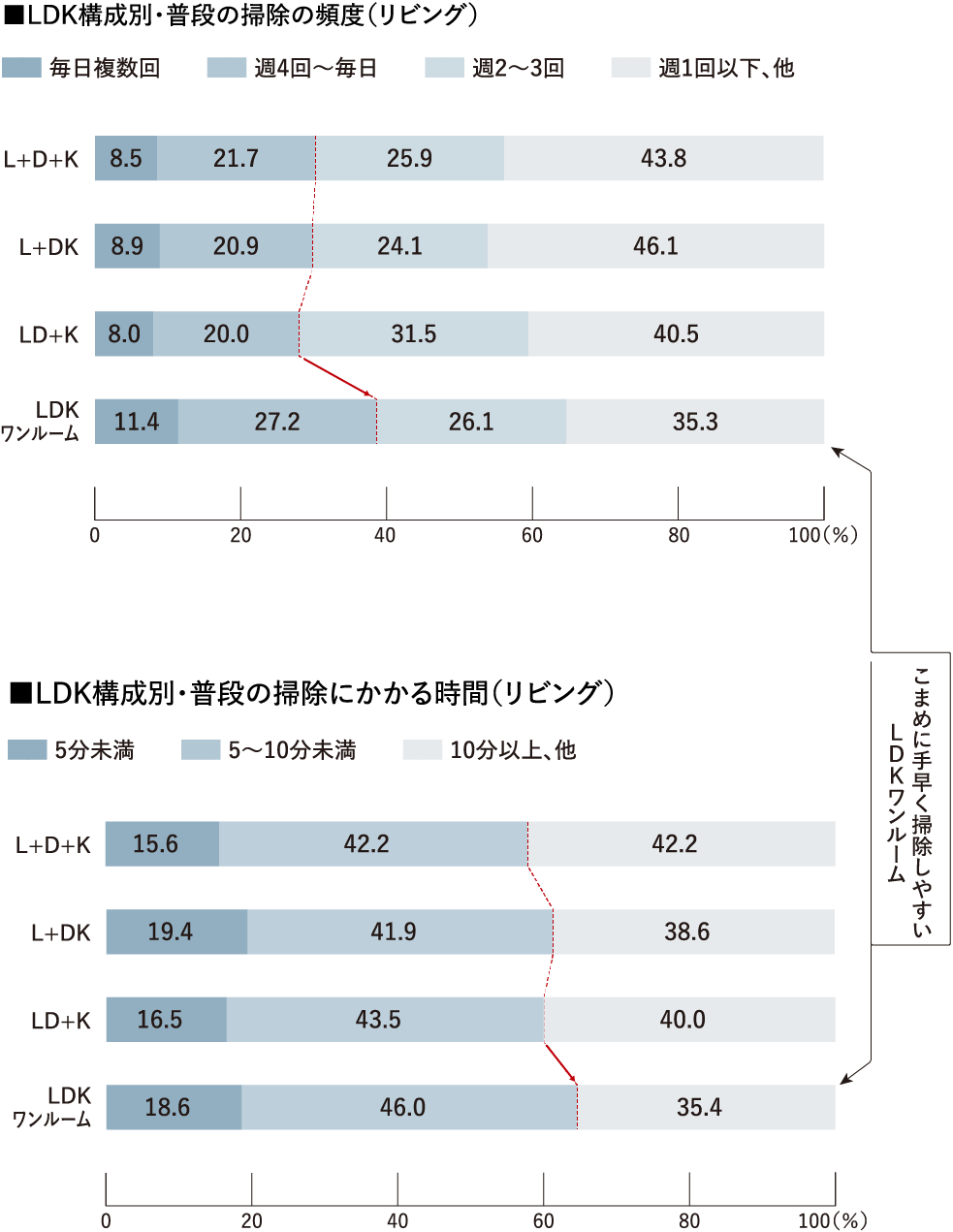〝こまめにサッと10分以内に〟の掃除スタイルは今後も広まる傾向ですが、その効率性はLDKの空間構成の影響を大きく受けることがわかりました。