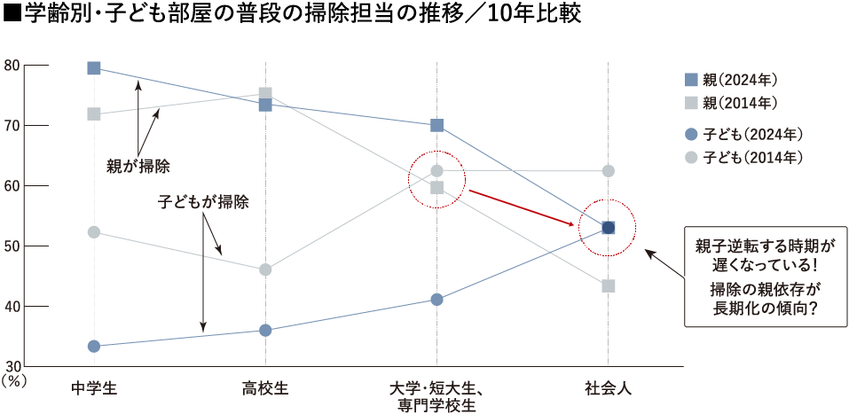 2014年には高校卒業後に子ども自身の掃除担当率が親を上回っていましたが、2024年では社会人になっても半数は親が担当しているという結果に。掃除の親依存が長期化する傾向です。