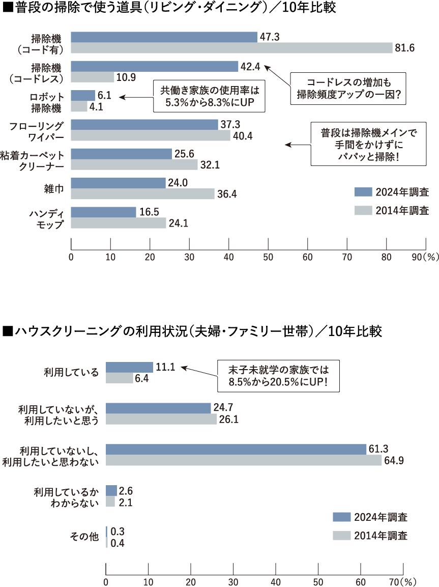 今回ピックアップしたテーマは「掃除」。2014年と2024年の調査結果を比較しながら、10年で変化したポイントやこれからの掃除の在り方、空間づくりの工夫などをご紹介します。掃除について、ご家族で話し合うきっかけにしていただければと思います。