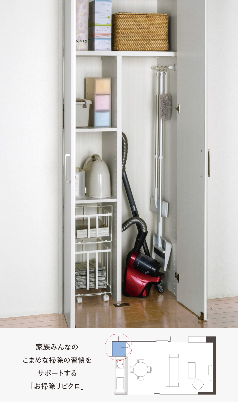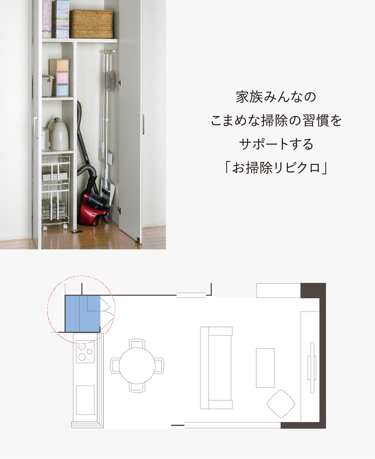 また、掃除道具をメインにしたコンパクトな収納「お掃除リビクロ」も有効。どちらもリビング付近にいつも使う掃除道具をまとめておけるので、家族の誰もがパッと取り出せてサッと使えるのが魅力。道具をわざわざ取りに行く手間もなく、気づいた時に気軽に掃除しやすくなります。