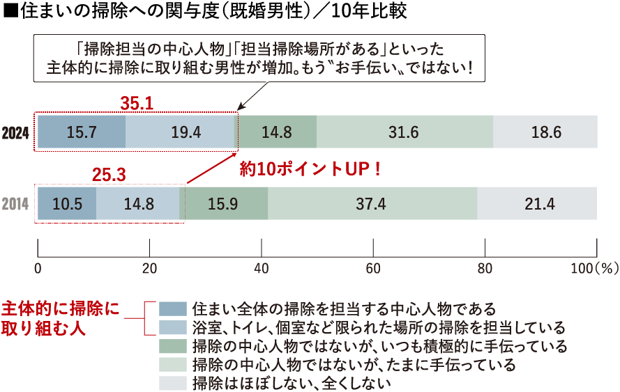 既婚男性が掃除に関与することが増えた点は想像のおよぶ範囲ですが、特に着目したいのが掃除に取り組む姿勢の変化です。〝住まい全体の掃除を担当している〟〝決められた場所の掃除を担当している〟という掃除に積極的・主体的に取り組む男性回答が、10年前に比べて約10ポイント上昇。これまでは〝お手伝い感覚〟だったのが、〝自分ごと・わが家ごと感覚〟へと意識が大きく変化してきていると言えます。