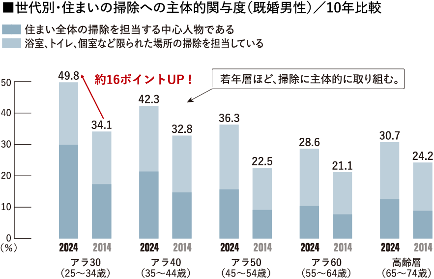 既婚男性の主体的な取り組み意識が高まっているとお伝えしましたが、その傾向が顕著なのがアラ30世代です。〝住まい全体の掃除を担当している〟〝決められた場所の掃除を担当している〟を含む主体的な取り組みでは2014年から約16ポイント上昇。ほぼ2人に1人(49.8%)に達しています。