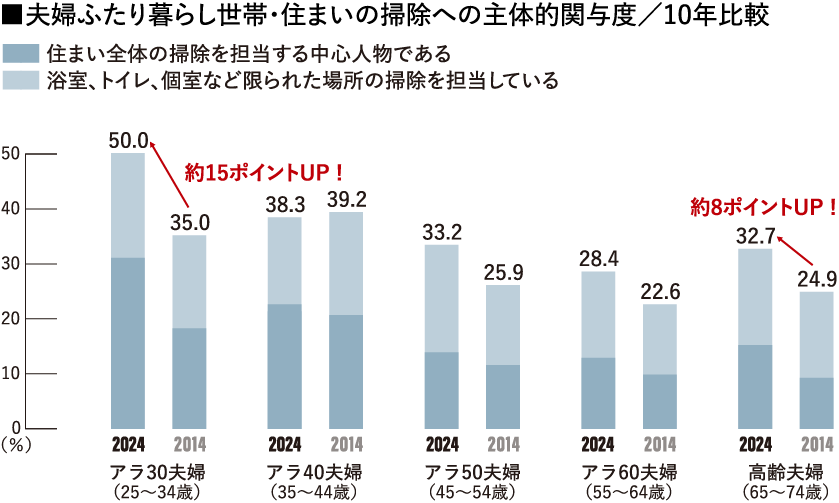 その役割分担意識は、やはりアラ30世代で最も顕著ですが、高齢世代でも高まる傾向です。特に夫婦2人暮らし世帯にフォーカスすると、アラ30世代の15ポイントアップに次いで、高齢世代で約8ポイントアップ。子どもたちが独立し、定年後に夫婦2人で暮らすなか、掃除の役割分担が進んでいると考えられます。
