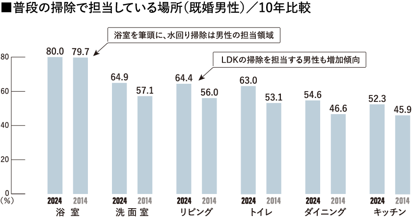 また、10年比較で着目したいのが「リビング」「ダイニング」の担当割合の増加。共に8ポイント以上アップしており、暮らしのメイン空間の掃除にも男性の意識が高まっています。