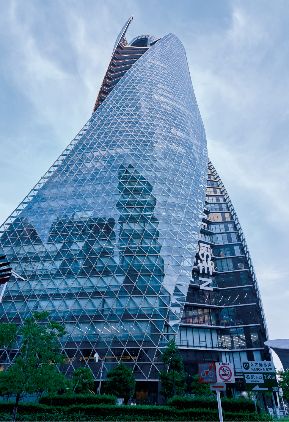 地上36階建てのモード学園スパイラルタワーズは、名古屋モード学園などを擁する総合校舎。螺旋状の外観デザインは、学生たちが時代の最先端を行き、社会へ羽ばたいていく様を表しているそうです。
