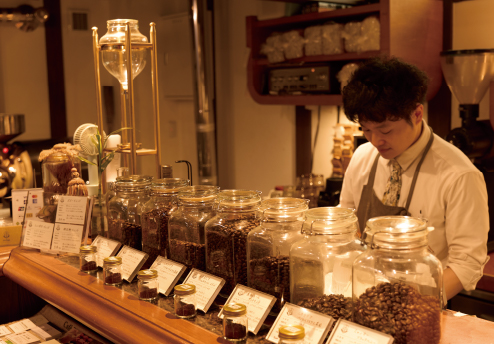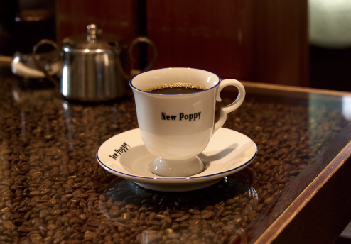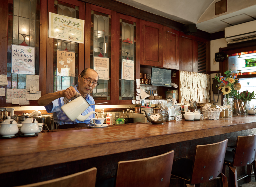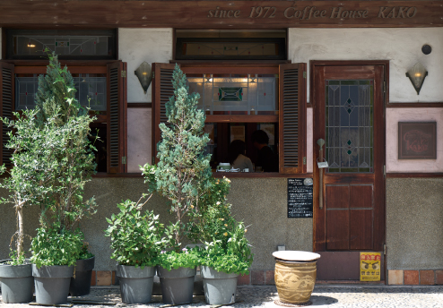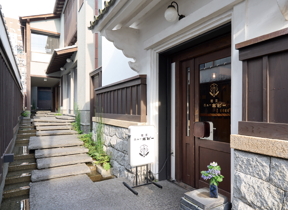 厳しい建物規制があるこの地区で、まるで隠れ家のような静かな空間でくつろげるのが「喫茶ニューポピー」です。地区の美観に調和した土蔵造りの店内には自家焙煎したコーヒーの香りが満ち、穏やかな時間が流れています。