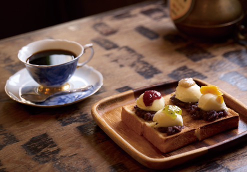 「コーヒーハウスかこ花車本店」はステンドグラスが印象的な純喫茶の老舗。名古屋ではじめて自家焙煎をはじめた名店で、昭和47年の創業以来マスターの土屋さんが丁寧に煎れる一杯を求めて朝から多くのお客様でにぎわいます。手作りのフルーツコンフィチュールと自家製あんこが楽しめるシャンティールージュスペシャルは必食。