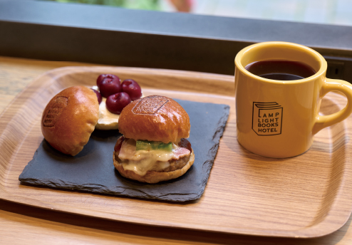 「本の世界を旅するホテル」をコンセプトにした「ランプライトブックスホテル名古屋」にあるカフェの本棚には、「旅」と「ミステリー」を中心に選ばれた本が約3000冊!宿泊者以外も利用でき、ちょっと気分転換したいときなどにぴったりの空間です。読書の相棒にはオリジナルミニハンバーガーがおすすめ。