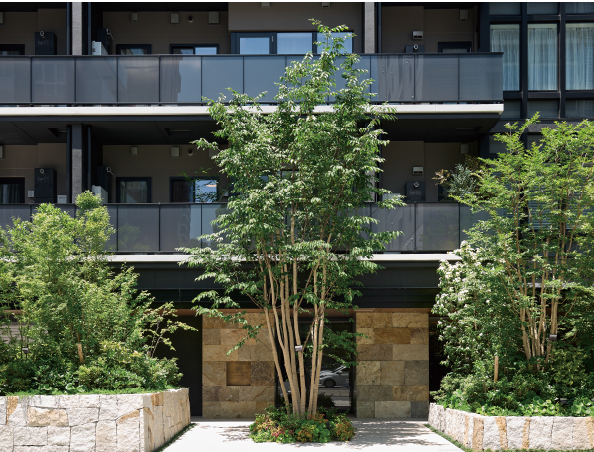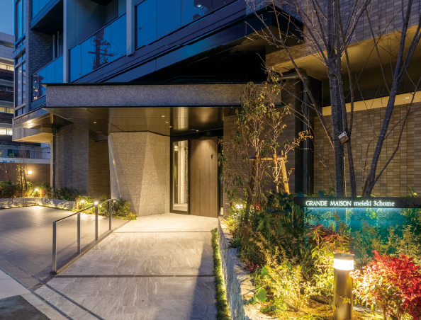 駅前のビル群に続く街並みの中でひときわ豊かな植栽が癒しの風景を生んでいるGM名駅三丁目。