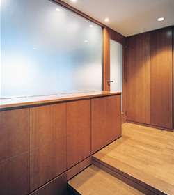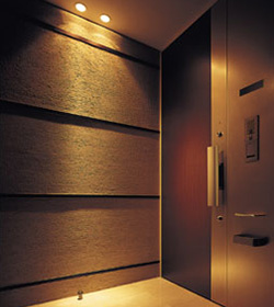 そのため、マンションの共用部分には「住まいとして、ほっとするような心地よさが必要です。いたずらに豪華さや流行を追うのではなく、やはり品のある上質なしつらいのために、部材にも本物の自然素材を中心に考えたい。ぬくもりに充ちた建築である以上、きっちりとした丁寧な造り込みや、きめ細やかな配慮というのもポイントになります。」住む人の心の動きに配慮して、快適に温かく迎え入れるようなホスピタリティーの充実こそ、今日的な「幽玄の関門」づくりへの、ひとつの回答とも言えそうである。