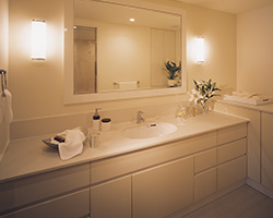 一日の始まりと終わりに使うパウダールームで気をつけなければいけないことに、まず照明があります。蛍光灯と白熱灯をミックスした自然光に近いカクテル光を使ったうえで手元を明るく、鼻の下やあごなどに影を作らないよう、間接光や反射光で下から光を当ててあげるという具合に、照明器具と光のあて方がポイントになります。