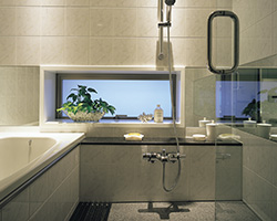 パウダールームやバスルームは着ているもの、つまり身体を保護するものがなくなっていく所なので、注意していることがあります。まず直接肌に触れる部分の素材を優しくあたたかみのあるものに。そして素材・色などを工夫して爽やかで清潔感のある空間に。もちろん掃除のしやすさも基本ですし、空間の広がり、光、通風、換気なども大切です。それが難しい集合住宅の場合でも、平面計画、断面計画などを工夫して、設計に活かしています。