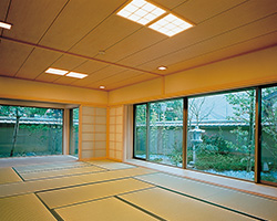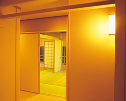 また、和室には「間」という表わし方があります。この「間」は、柱で創られる広さを意味するもので、家屋内の区切りを示します。そしてこれらは障子や几帳、ふすまなど“あいまい”な「しきり」で区切られます。隣の部屋から伝わってくるもの、建物の外部から感じるもの。障子などを通して、鳥の声や太陽の光の変化などを気配として感じ、それによって移りゆく季節と情緒を味わうという、日本人の美意識に通じるものです。しきりを取り除いた場合は大広間が生れます。壁の文化である欧米とは異なる、拡張性を持った柱の文化と呼ばれる所以です。