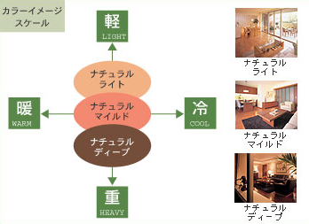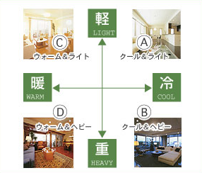 「家具や照明のバランスは、イメージスケールで判断できます。それは家具やカーテン、照明、小物等が『軽』『重』の縦軸と『暖』『冷』の横軸のどの座標に位置するのかを判断するものさしです。形、素材、色など7つの観点から総合的に見ていくことで、トータルコーディネートがしやすくなります」(佐古田)