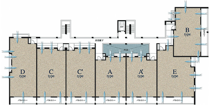 ●静寂性を保つ工夫寝室が共用廊下に面する場合、居室と共用廊下の間に吹き抜けや、室外機置き場を設けることで、プライバシーを守り、足音や声などの遮音に効果がある。