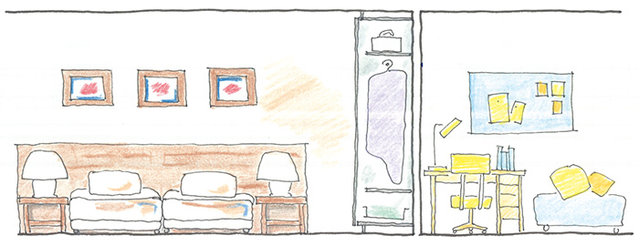 寝室の基本的な機能とは、「心地よい眠りのための空間」であること。そのために、まず考えなければいけないのが、「音」の問題です。 「グランドメゾンでは、外壁はもちろん床スラブに十分な厚さを確保して、外からの騒音や上下階の遮音性を高めているんです」(芝) 静かな夜には水の音も気になるもの・・・ 「居室内でも、寝室と水回りが隣接する場合は注意深く防音措置をとっています」(中田) 「全戸の間取りでは、寝室の真上が上階の水回りにならないよう設計します」(芝) また、寝室は共用廊下に面することが多いので、間に吹き抜けを設けたり、居室内でも子ども部屋の横は壁だけでなく大型収納を間にはさむなど、音に関する様々な工夫をしています。