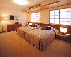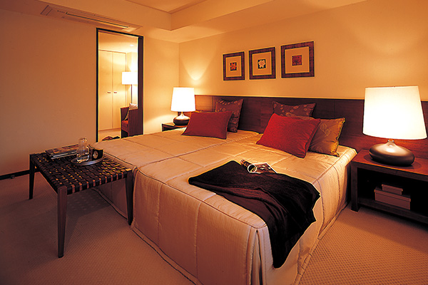 「グランドメゾン京都御所西」和風のテイストでコーディネイトされた寝室。ゆったりとした広さ、眠りの目線を配慮した空調の位置も落ち着く。