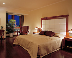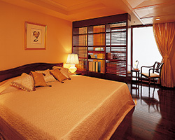 「グランドメゾンの主寝室はベッドを置いても十分広め。プライベートリビングとしてのしつらえも可能です」(芝)
