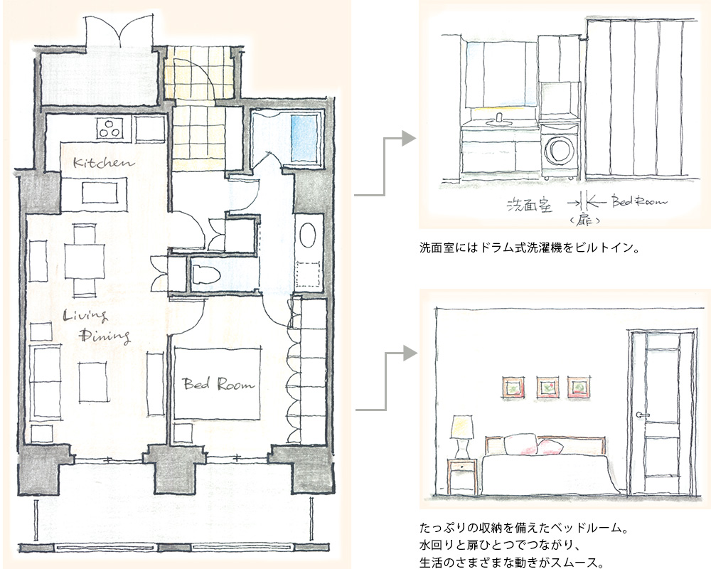 水回りにドアひとつでいける機能的な動線。ウォークインクローゼットを設けた寝室。シングル女性などお客様を特定したプランは寝室のあり方も明解。