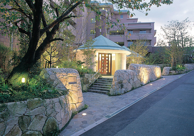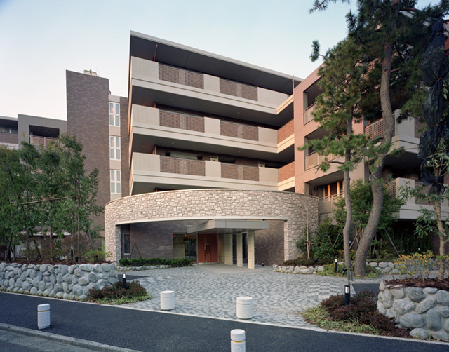 グランドメゾン鵠沼橘既存樹の松を残し、石垣が街なみに調和する。