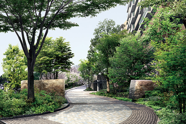 「横浜マンション事業部以外のエリアでも、『ツグ・ノコス・カエス』の考え方が浸透しています。名古屋の『グランドメゾン白壁櫻明荘』は、料亭の跡地に建てたのですが、既存樹を残すだけでなく、歴史的な建造物である長屋門や見事な庭園を残し、敷石も再利用しています。また、青山学院大学跡地に建てた『東京テラス』は、ヒマラヤスギをはじめとする既存樹と赤レンガ塀を継承。福岡の『グランドメゾン荻の宮』は、既存の桜をシンボルツリーとして上手く残しています。」(高橋)