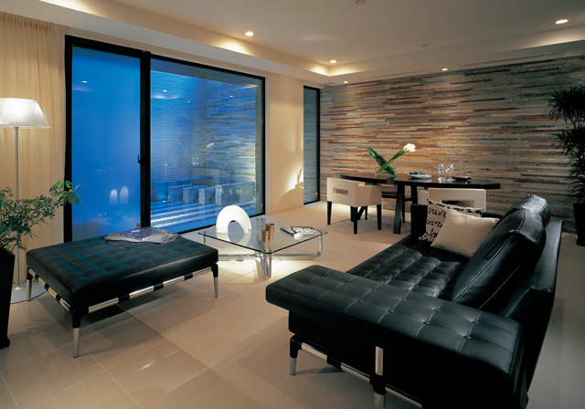 「例えば『グランドメゾン代沢①』のように、外部と内部で窓を通してつながっている壁を同一仕上げ(タイル仕上)にし、空間のつながりを大事にしています。内部のリビングルームと外部の水盤が一体となって開放的な空間になり、面積以上に広く感じられる効果があります。」(糴川)