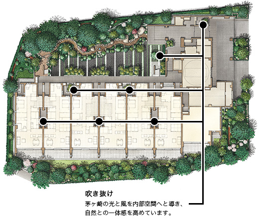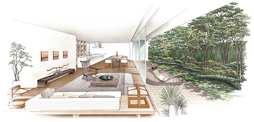 茅ヶ崎を込めた住まい。 この地の新しい象徴ともなり得る豊かな緑を擁した外構の植栽。上質さの中にも和みが溢れる広々としたガーデンテラスのしつらえ。住棟には、各戸に茅ヶ崎の光と風を存分に取り入れることができるように、吹き抜けを設けました。住まうほどに、永く続く快適の空間を実感いただけます。