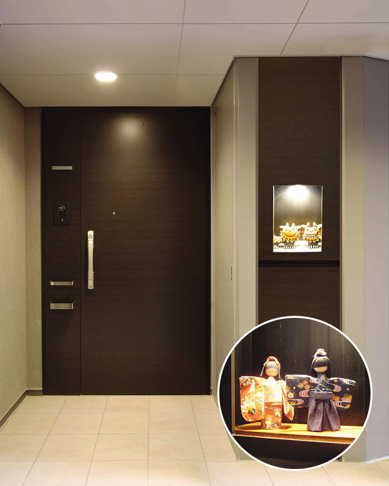 積水ハウス:表出という点では、共用廊下から見える玄関前に「ウェルカムボックス」を設けたマンションがあります。ガラス貼りのボックスで、折り紙が好きな方は折り紙を、また季節の室礼(しつらい)を演出するなどお楽しみいただいています。