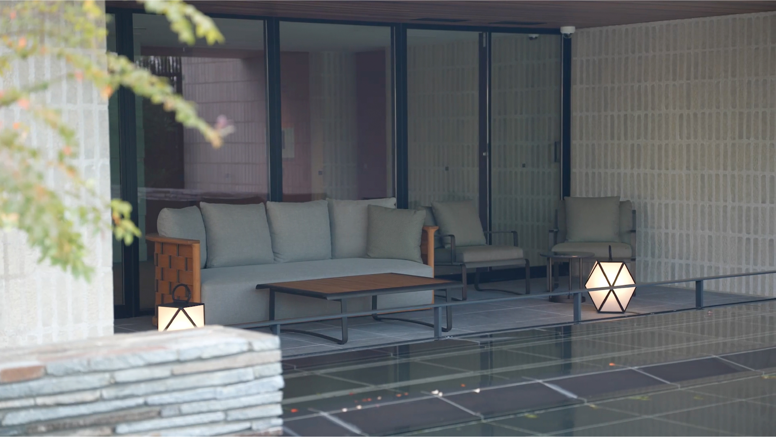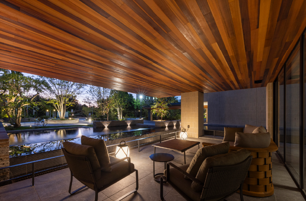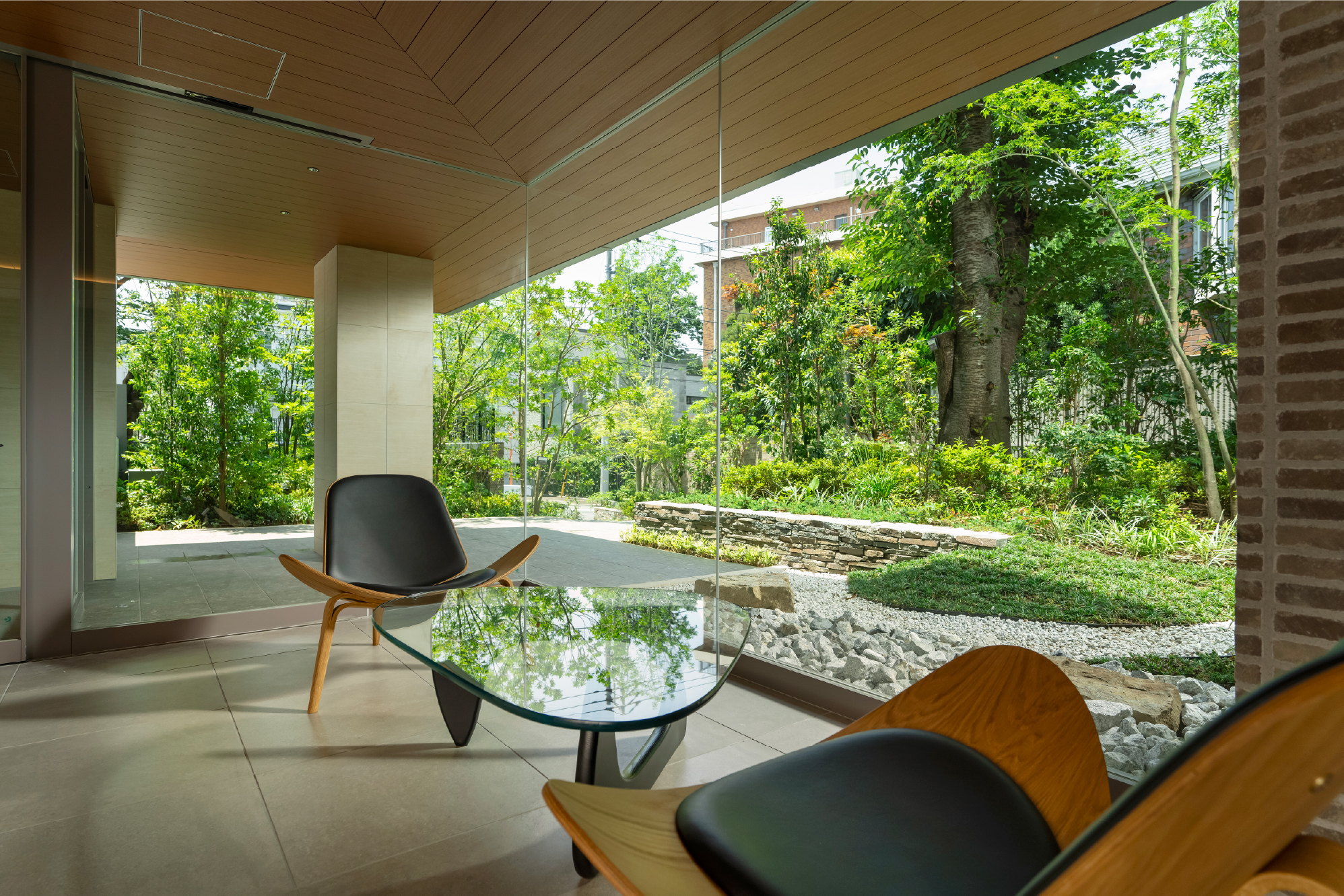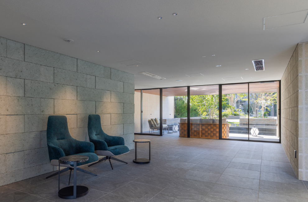 庇に護られた車寄せのあるエントランスをくぐると、そこには飾らない気品に包まれた迎賓空間が広がります。見せ場となるのは、緑あふれる奥庭へと視線を誘う、天井高約5.5mの吹き抜け空間。奥庭に面した窓辺と広場につながる窓先には3つのラウンジを設け、四季の移ろいを感じながら寛げる贅沢な居場所をつくり出しています。中でも広場を望むテラスラウンジは、山手の丘を通り抜ける風を感じながら、木々の潤いや水盤の煌めきに癒されるプライベートな半屋外空間。木立の切れ間から山手本通りを歩く人の気配を感じながら、敷地の奥行きや植栽のヴェールに護られて安らぐひとときは、山手らしさを象徴する心豊かなシーンの一つといえます。