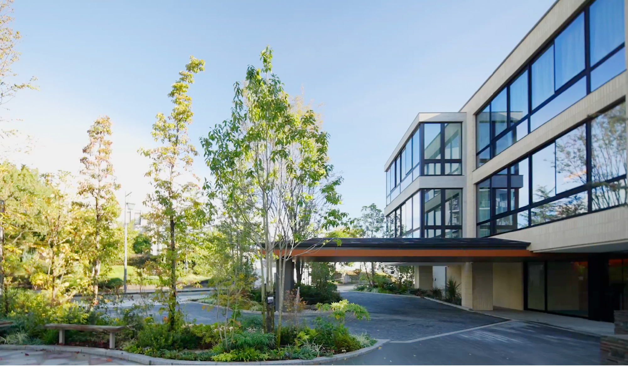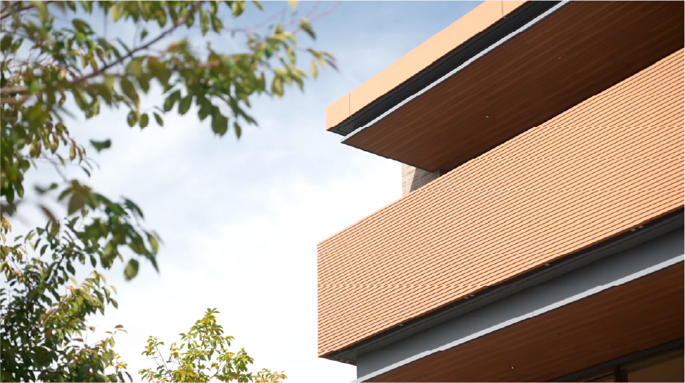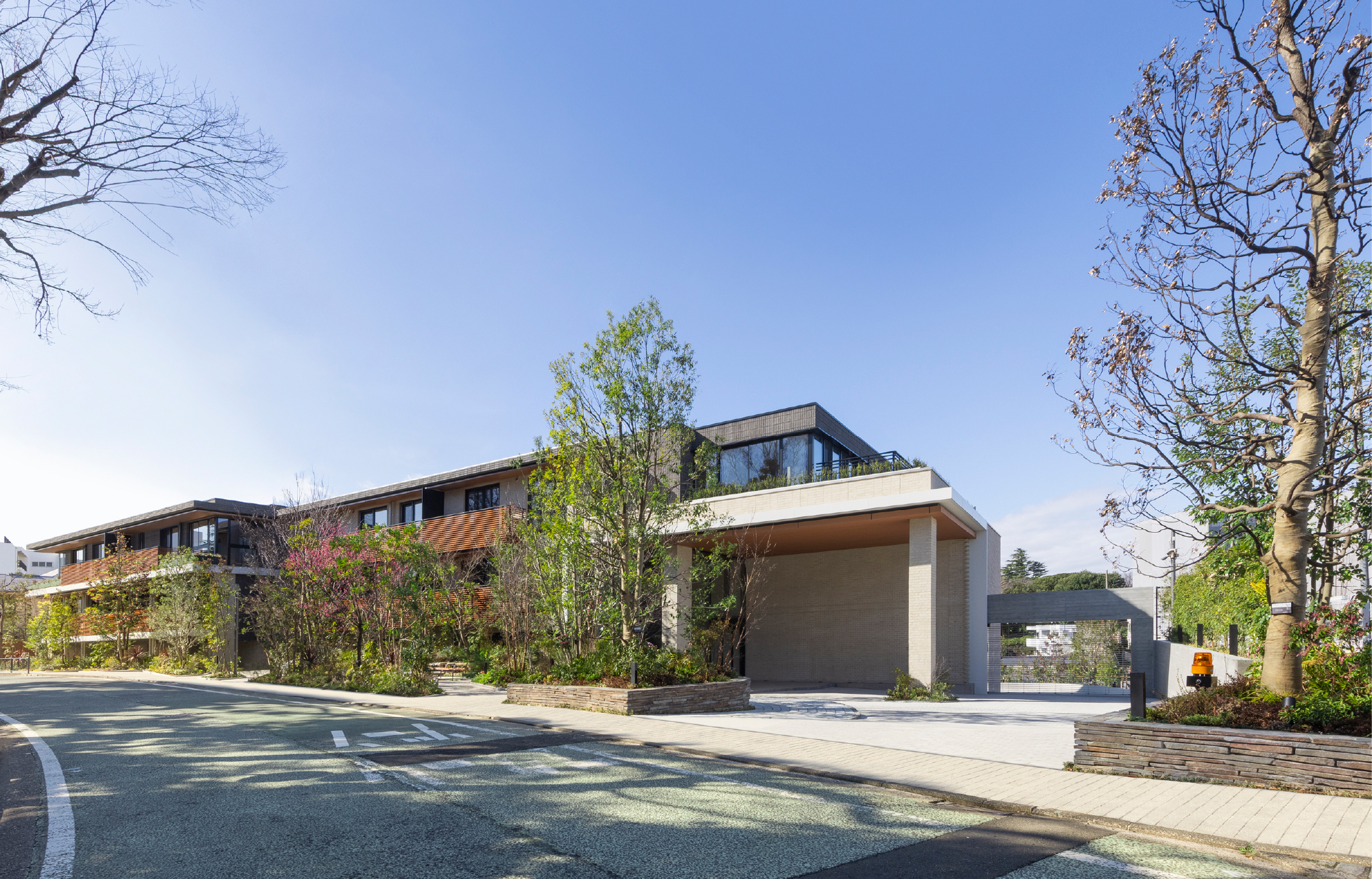 山手本通りから緩やかに下っていく陣屋坂。「GM The山手253Marks」の西側では、木端積みの植栽帯に沿って途切れなくつづく花木が、季節の訪れを告げながら道ゆく人の目を楽しませています。煉瓦調のタイルを基調とする建物は、擁壁の高さを抑えながら上層部をセットバックさせ、ふと見上げた視線の先に、多段緑化による立体的な自然美を演出しています。