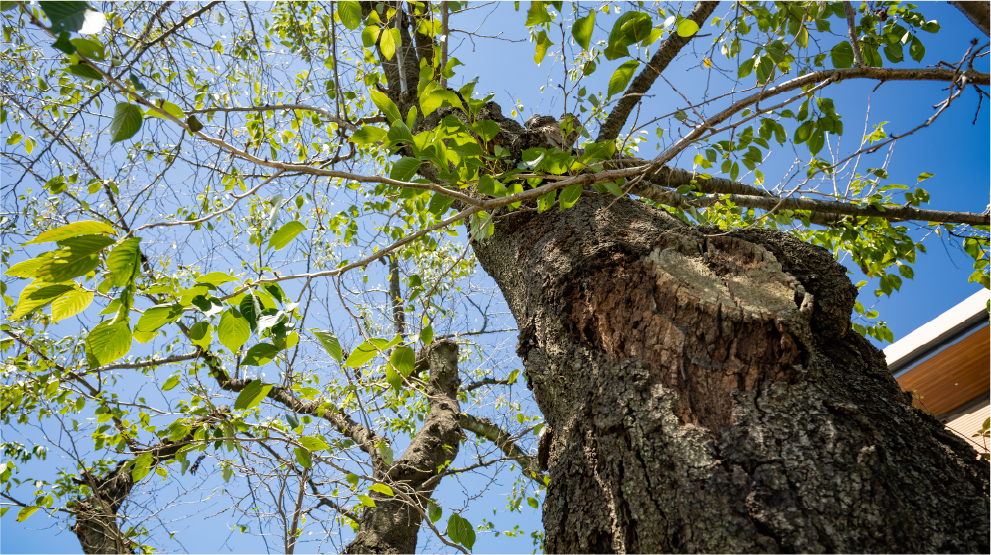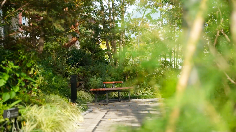 通りに沿って十分な余白をとった外構には、物件の名称にもなったガーデンが広がります。公と私の緩やかな境界を描くその庭は、イギリス館の成熟した木々の緑に響き合いながら、通りに若々しい息吹をもたらすためのランドスケープ。重層的な木立の足元には、ふと寄り道したくなるような小径やベンチを配し、心地よい木漏れ日や木陰に包まれるひとときを街ゆく人々と分かち合える場を創出しました。植栽には、ヤマザクラやサルスベリ、イロハモミジ、さらには近隣のローズガーデンに呼応するバラやラベンダーなど、季節の彩りをリレーする樹木や草花をふんだんに。奥ゆかしくも華やかに、その風景は時の経過と共に趣を増していきます。