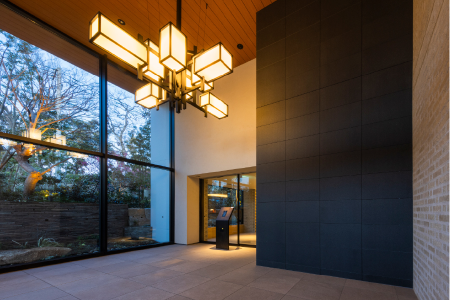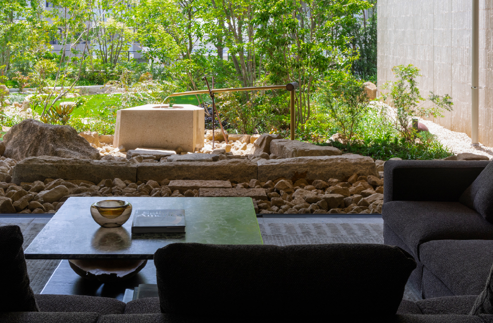 このレジデンスに宿るのは、山手にふさわしい洗練されたプライベートのかたち。石庭の趣と柔らかな自然光に包まれて、静寂と温もりが融け合うラウンジ。見た目の華やかさや豪華さではない、住まうことに対する奥深い考察から生まれた空間価値。本当の豊かさを知る方々の琴線に触れる邸宅様式がここにあります。