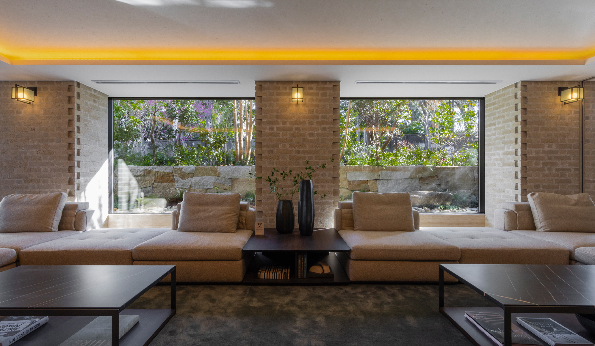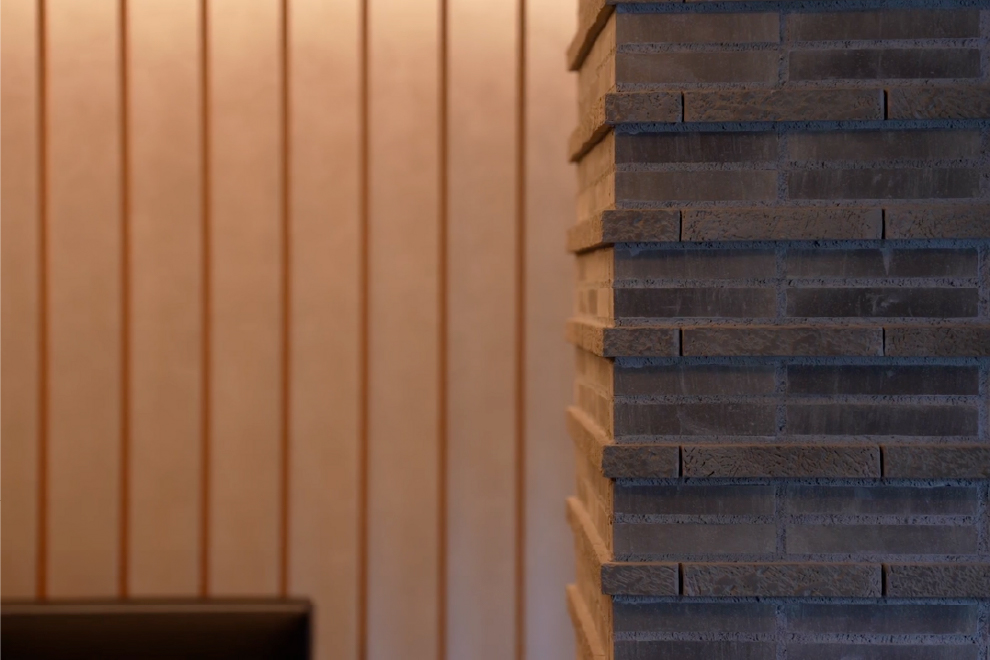 そして、邸内に広がるのは、ガーデンの四季を風景画のように切り取る優雅な迎賓空間。窓から注ぐ自然光、床に落ちる木漏れ日、季節の花、ふと気づく葉色の変化。日々刻々と移ろう自然の趣が、住まう方を心からの安らぎで包み込みます。素材や色を限定した端正な空間の柱や壁には、山手らしい異国情緒を感じさせる煉瓦積みのデザインを採用。丁寧な手仕事だけが生み出すことのできる風合い豊かな素材の質感が、時流に左右されない美しさを求めた空間に確かな気品を添えています。