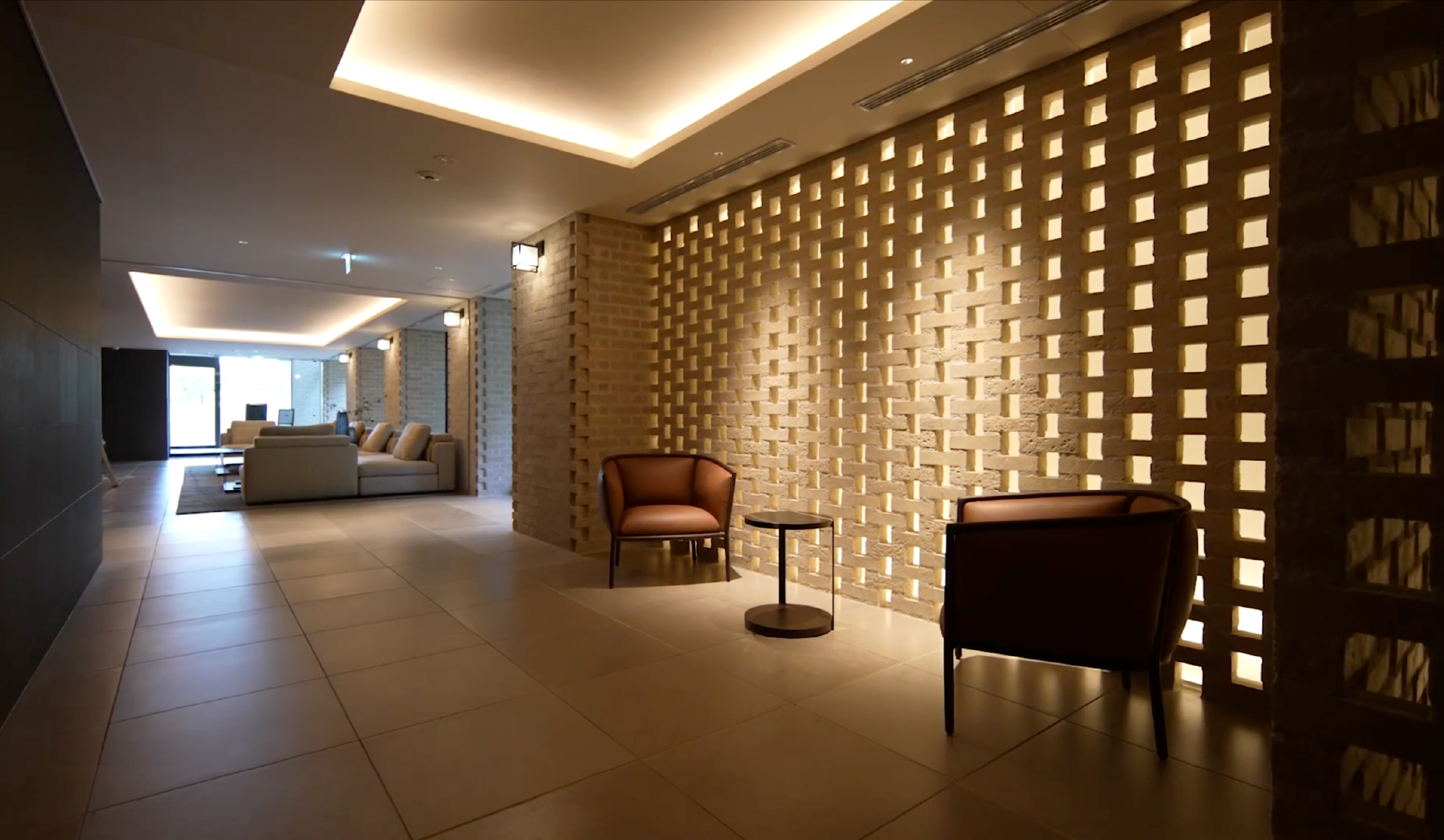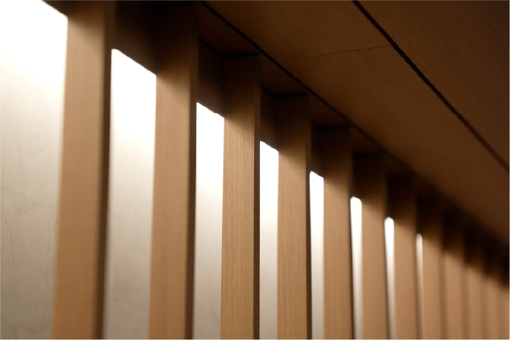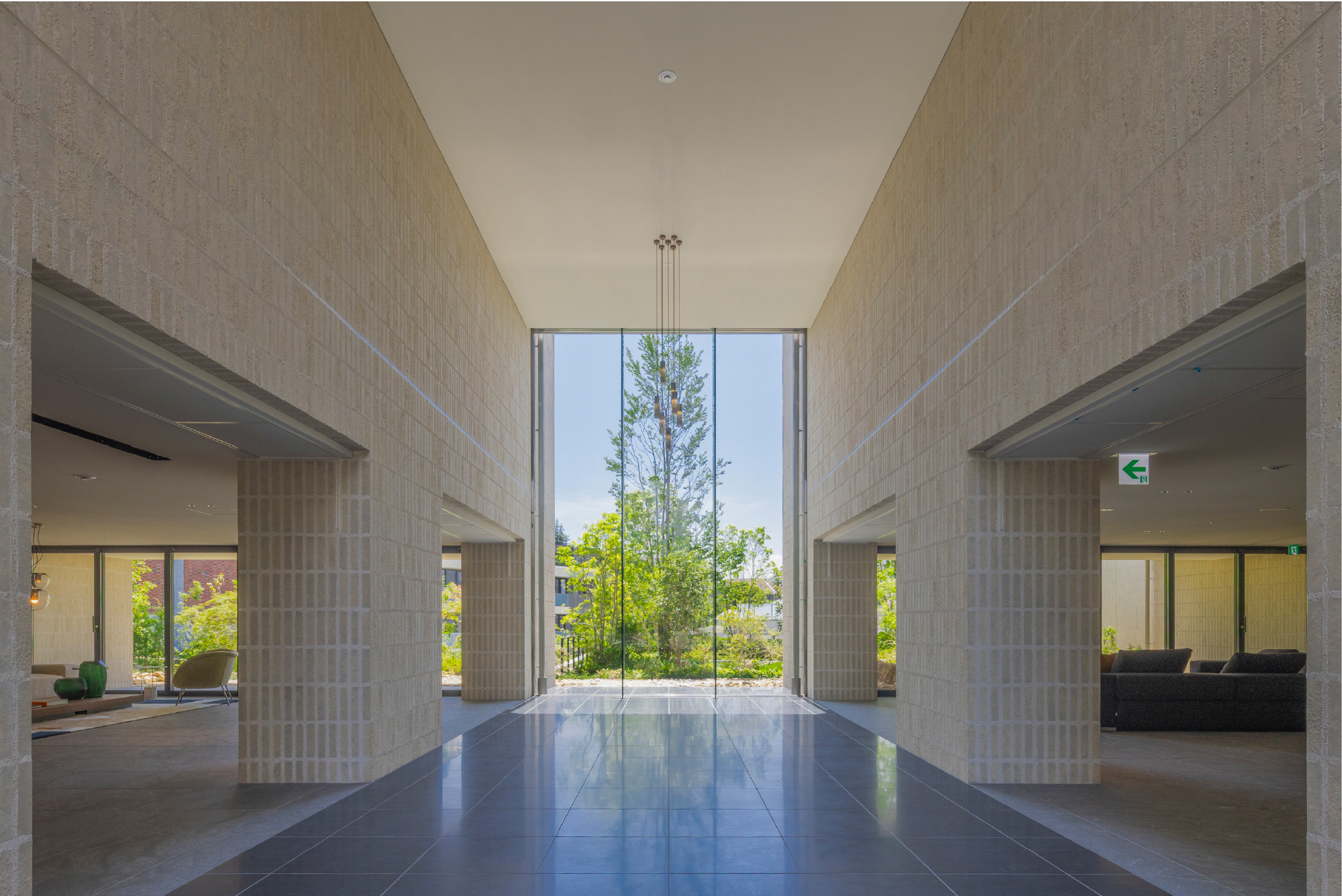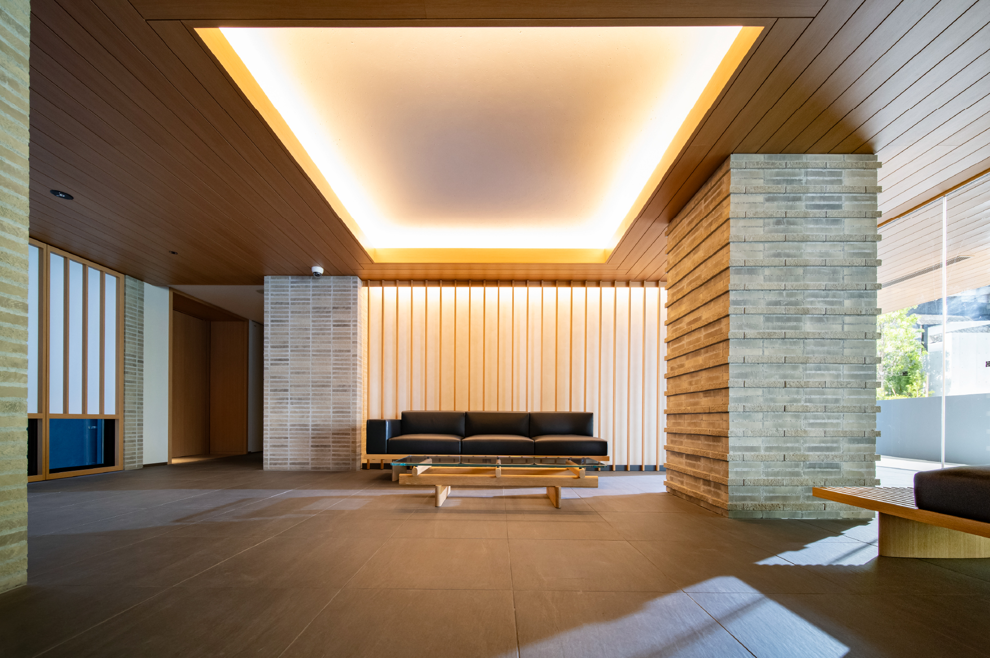 庇付きのピロティ空間に護られた長いアプローチの奥、左側には上質なソファを配したエントランスホールが広がっています。そこは、美しい通りの余韻を感じながら、時の余白を味わうための場所。石目の床と木調の天井、障子のような透け感を持つファブリックガラスの壁面など、個性的でありながらも飾らない素材と意匠の一つ一つが、隠れ家のような落ち着きを求めた空間にひときわの静寂を演出しています。