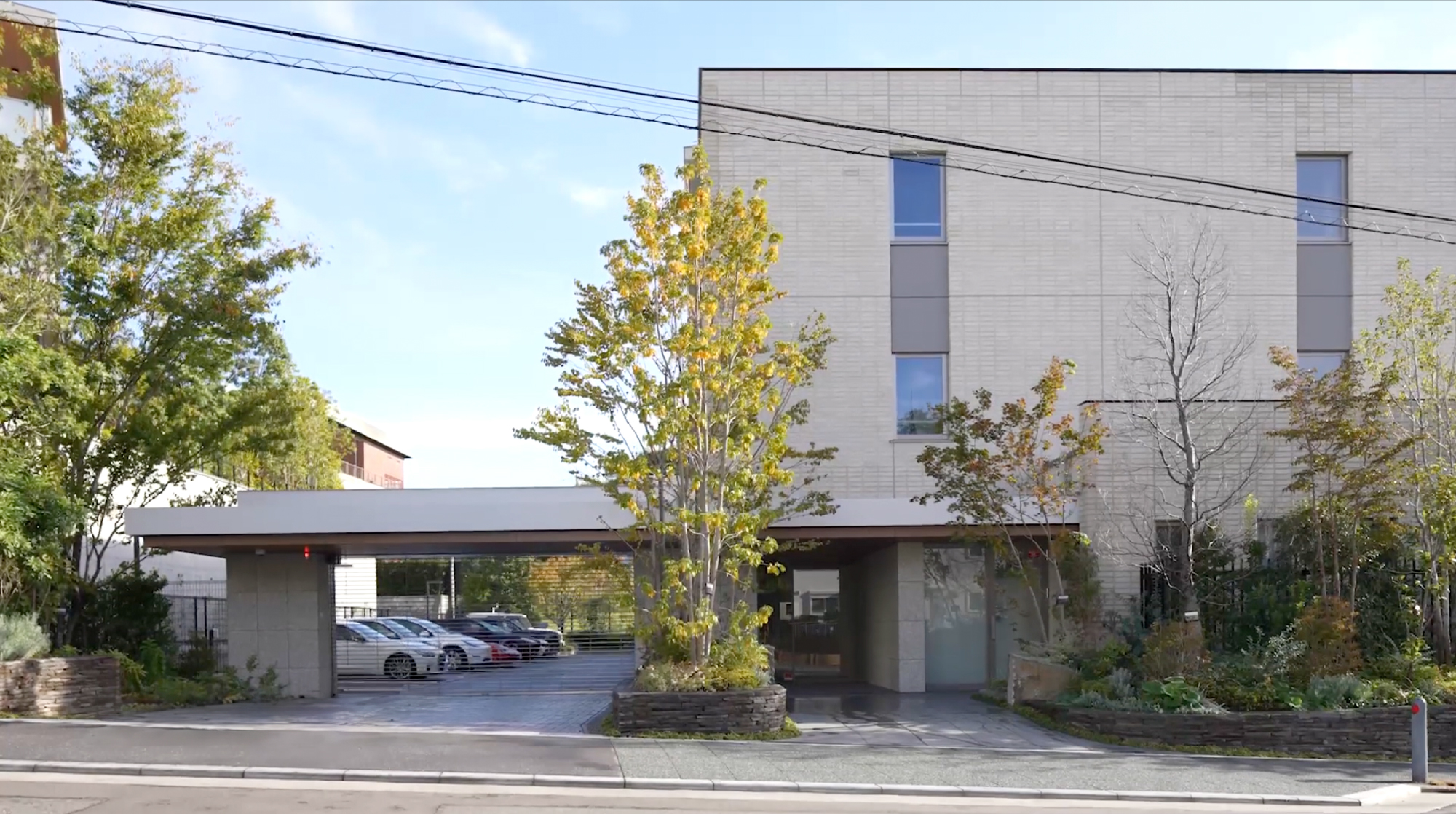 程なく通りの風景は、隣接する「GMThe山手253Hills」に引き継がれます。建物の目印は、木立の切れ間に設けられた風格あるゲート。「GMThe山手253Marks」との間に配置された平置き駐車場の余白が、通りからの視線を空につないでくれます。奥行きある駐車場の先に見えるのは、イギリス館の向かいに佇む「GMThe山手253Garden」。緻密に設計された風景のレイヤーは、全6棟のトータルデザインを追求したプロジェクトの所産といえるものです。
