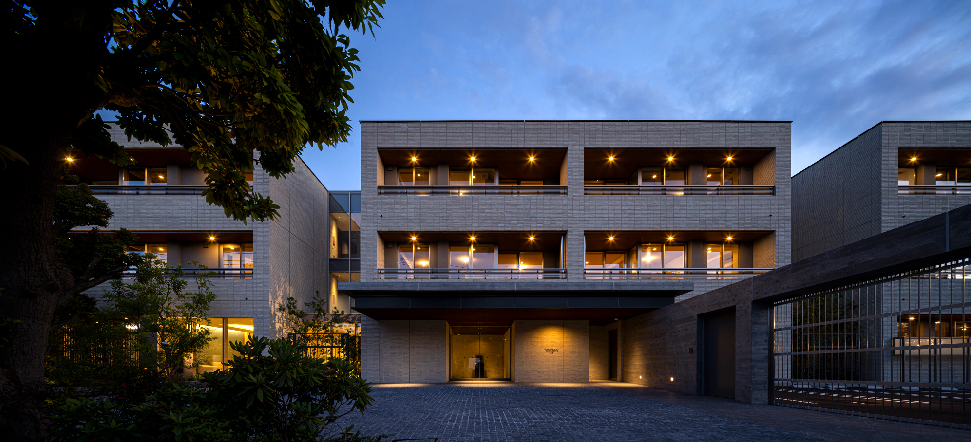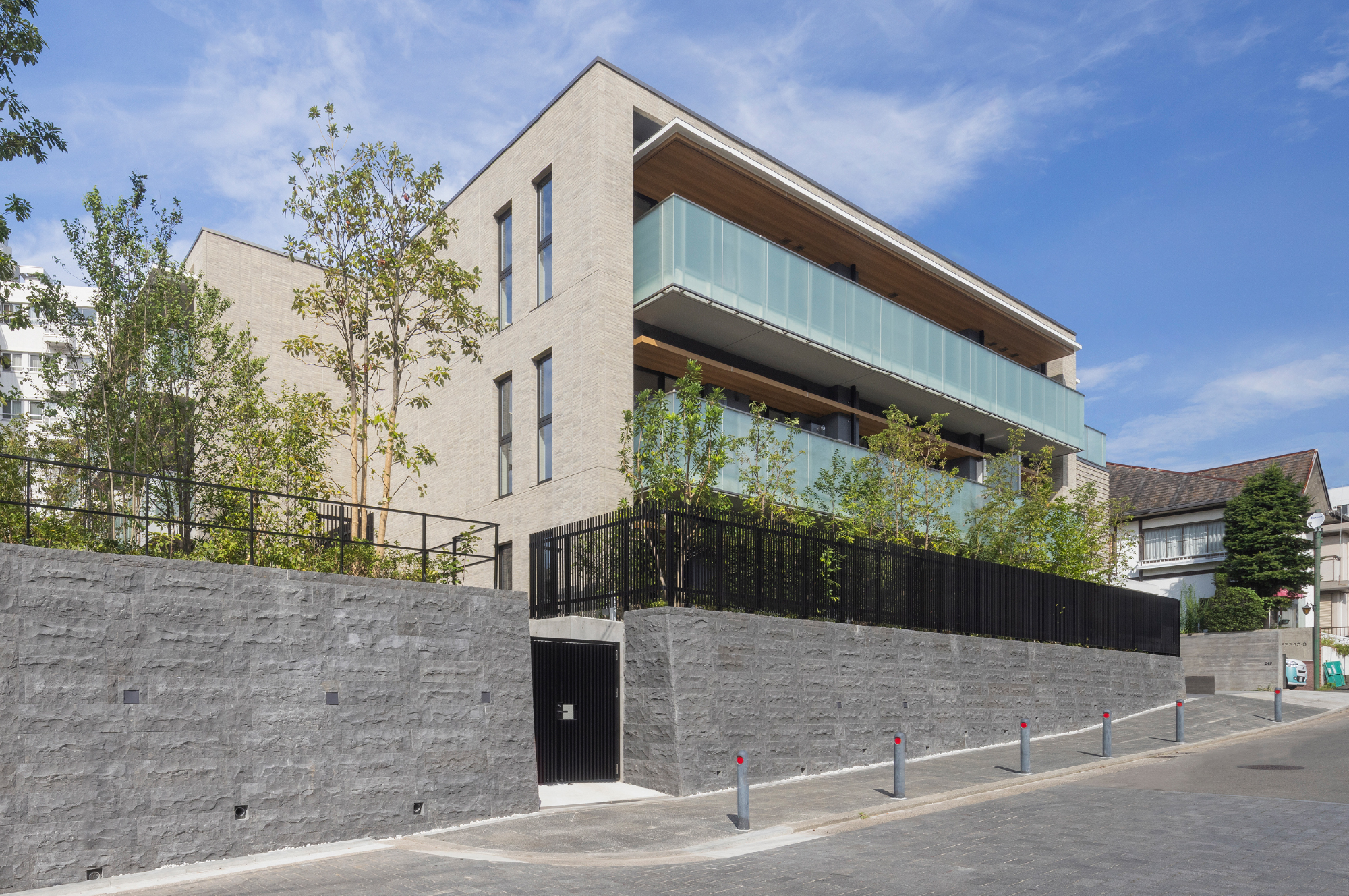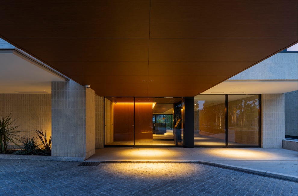 3つのグランドメゾンが描く道の景。「GMThe山手249」は、その最後を飾ります。建物に重厚な印象をもたらす擁壁は、山手の街並みに見られるブラフ積みをオマージュしたもの。壇上を彩る四季の植栽。凛とした印象のバルコニーガラスと温かな木調の軒裏の対比。重層的でスタイリッシュな庇と一体的にデザインされたピロティの先に、住まいとしての奥行きと街に対する親密な態度を湛えて沈黙するエントランス。モダンでありながら懐かしく、どこまでも大らかなその建築には、洗練されたデザインの奥に存在する古き良き洋館の姿が透けて見えるかのようです。
