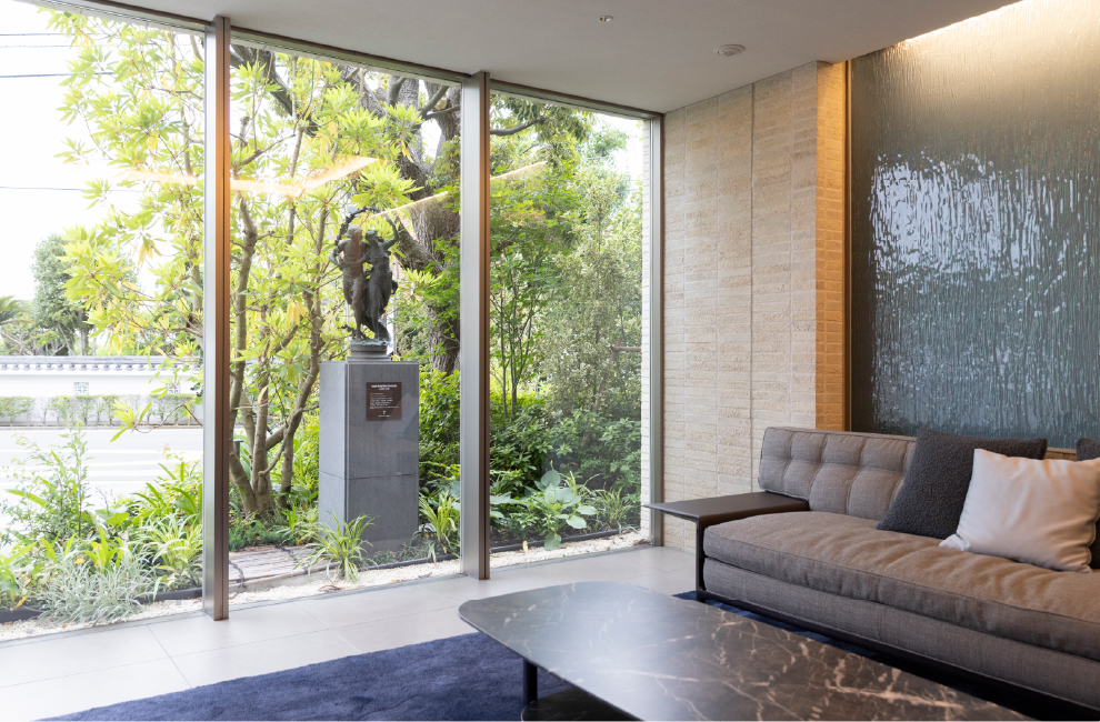 ここは、明治のはじめに英国公使館が置かれ、その後は外国人貿易商の大邸宅や山手ロイストン教会へ受け継がれてきた由緒ある土地。全体計画においては、ラウンジやエレベーターホールにつながる中庭に教会から受け継いだブロンズ像やアイアン門扉のオブジェを配置すると共に、タブノキ、スダジイ、キンカン、トウカエデなどの既存樹木を生かすことで、土地の記憶と共にある住まいの風景をつくり上げました。