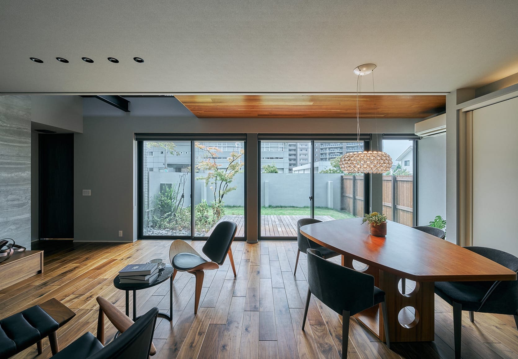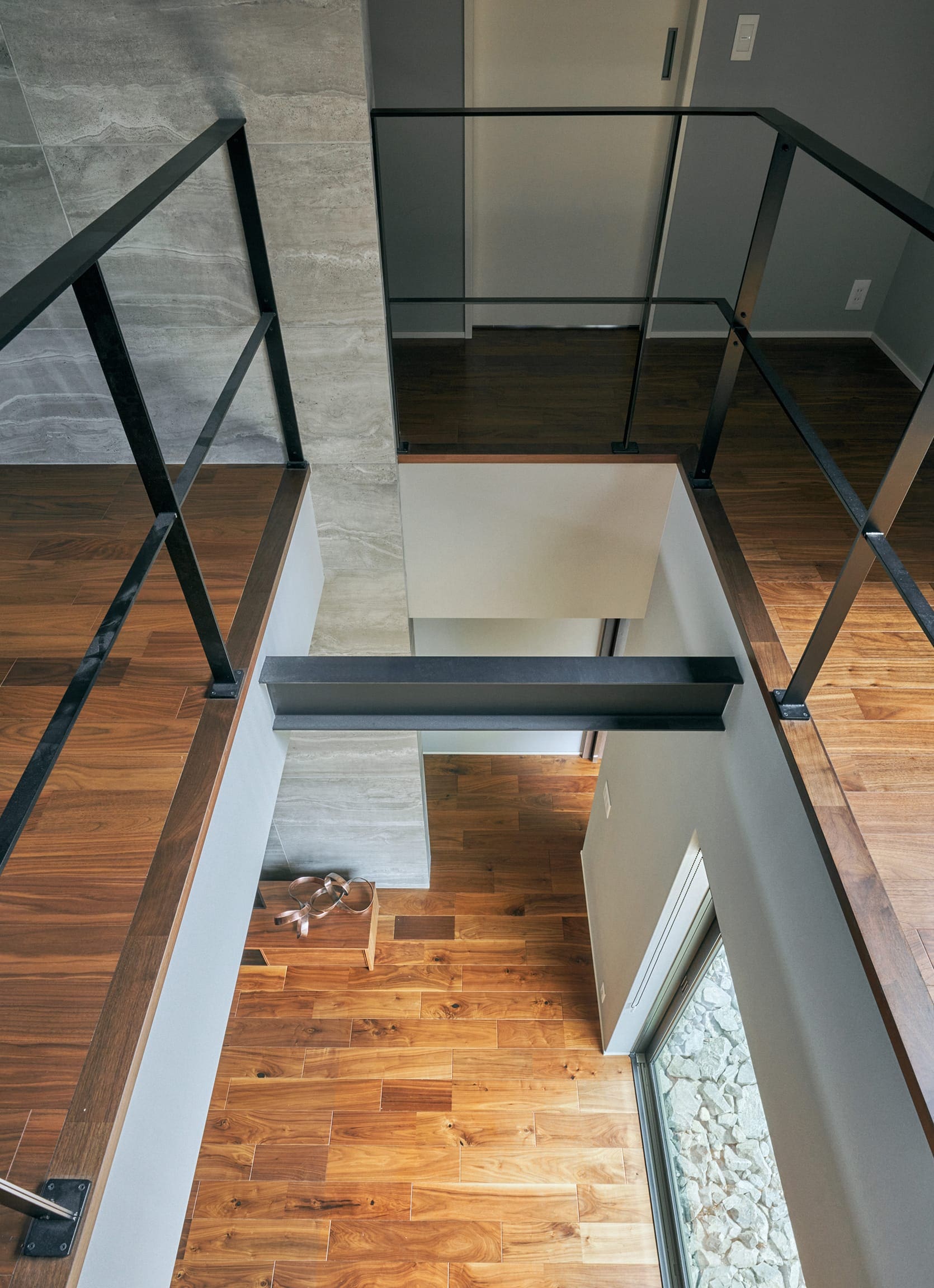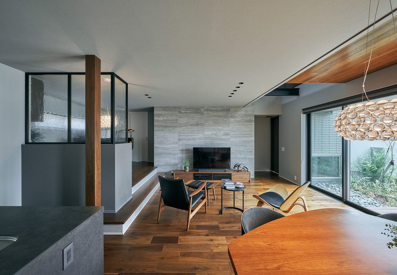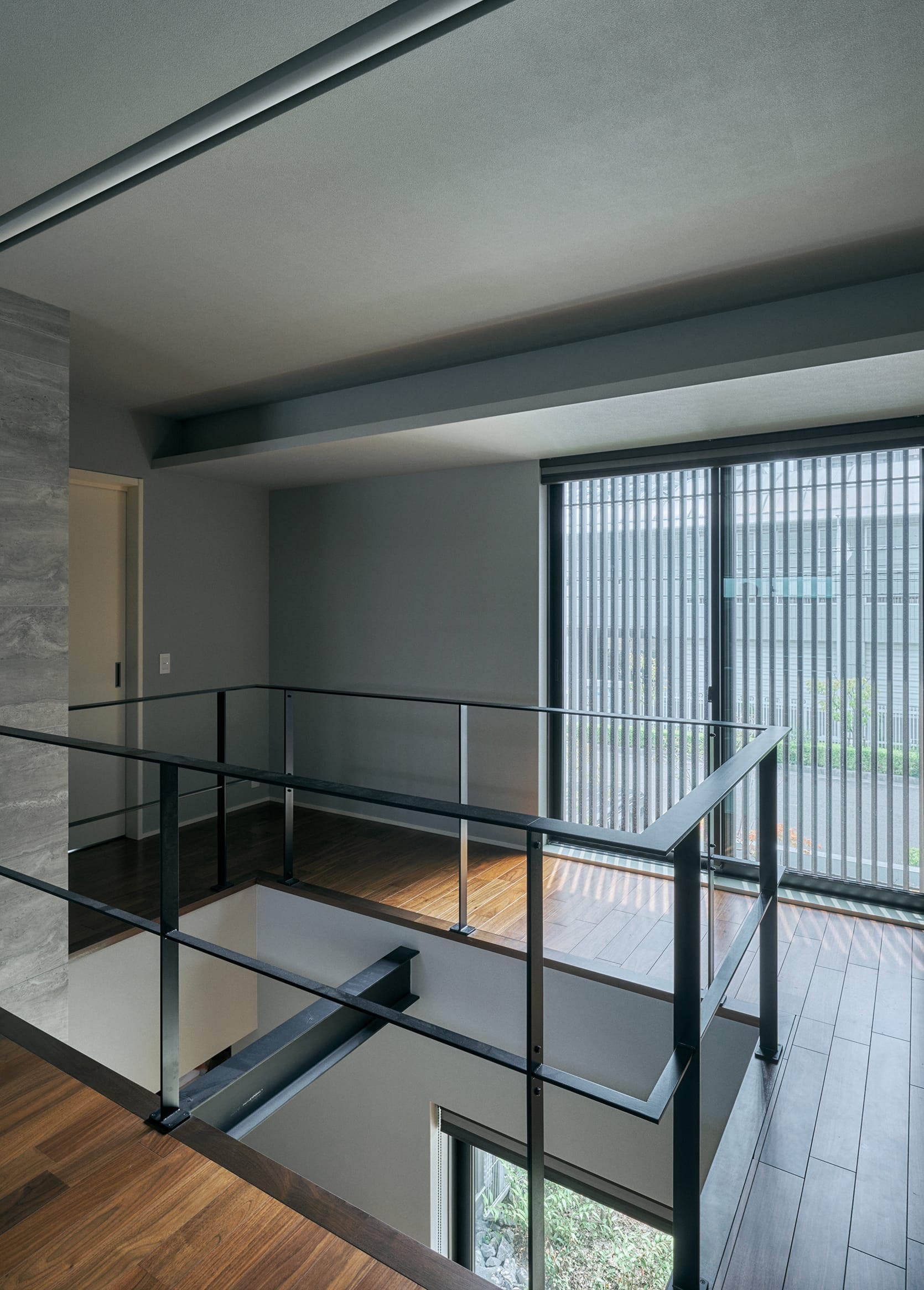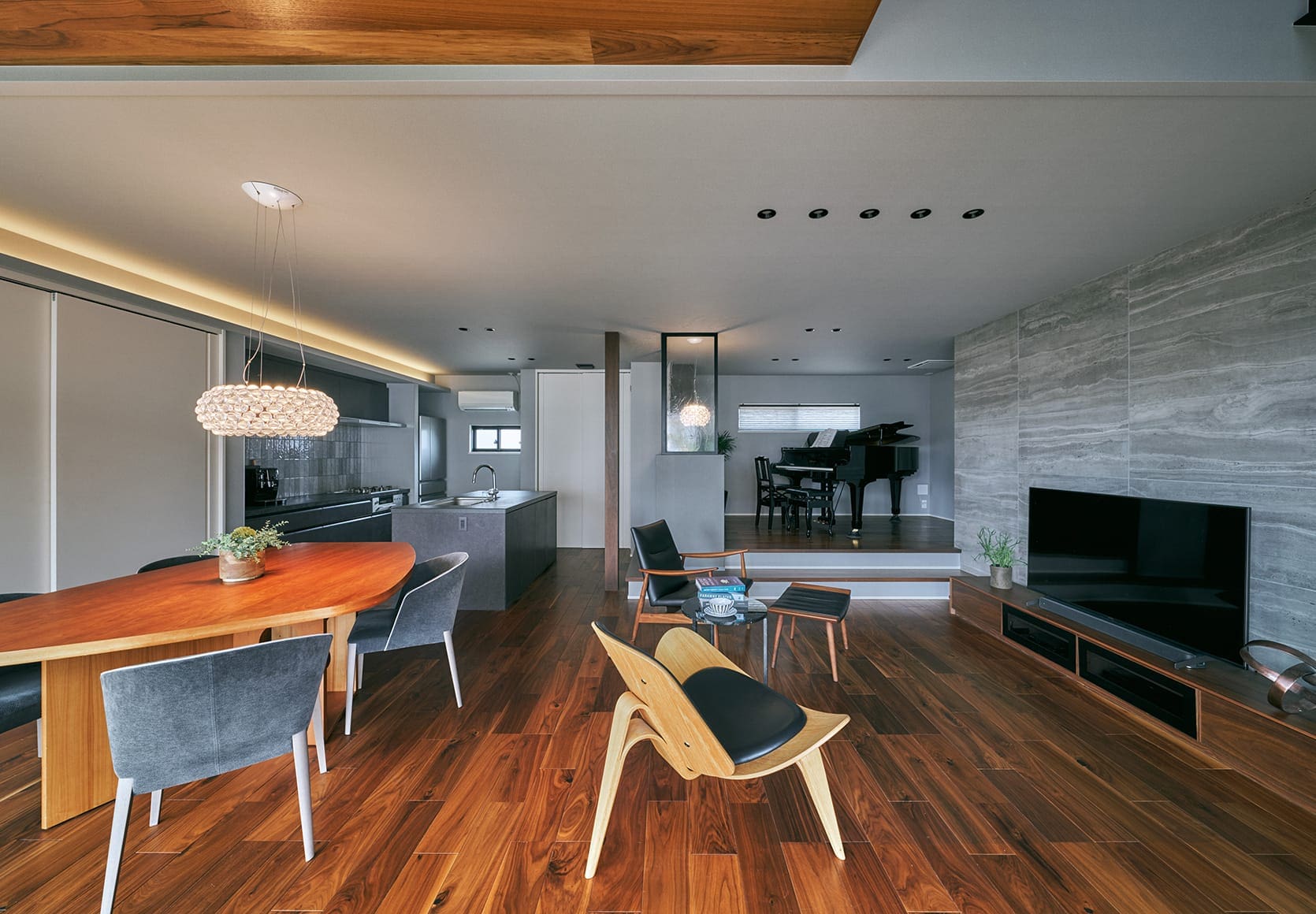 美しさと遊び心を追求した邸宅。グランドピアノのためのステージがあるリビング。そのステージから2階へとつながる書斎スペースを一体空間として考えたプランです。抑えた光が差す南側吹抜は上下階を緩やかに結び、ご家族のつながりをいつも感じられる優しい空間に。内観はグレーの壁面を基調に、黒い格子や濃い茶の床、外部の緑とも調和。外観の色調も合わせ、品のあるすっきりとした佇まいをめざしました。