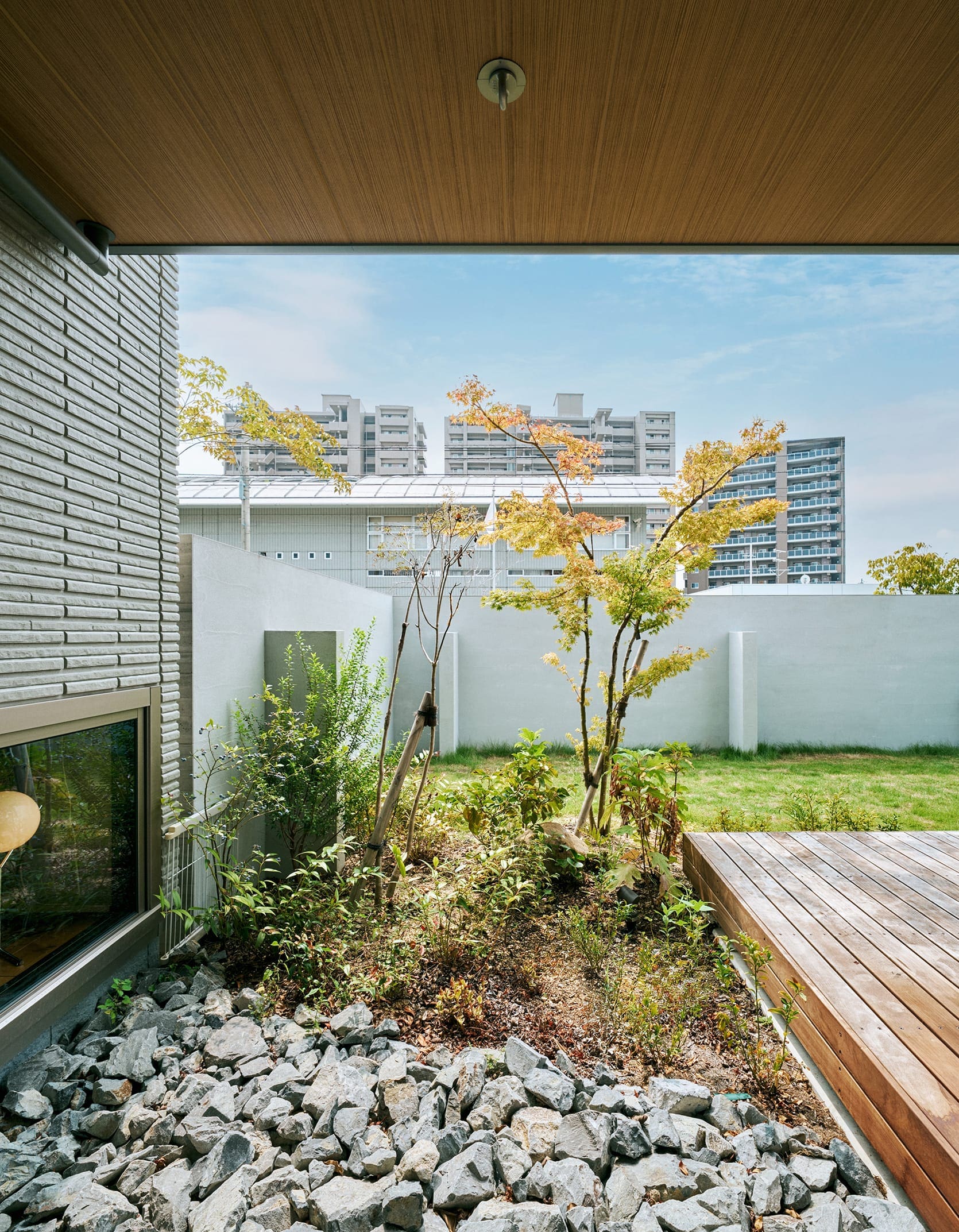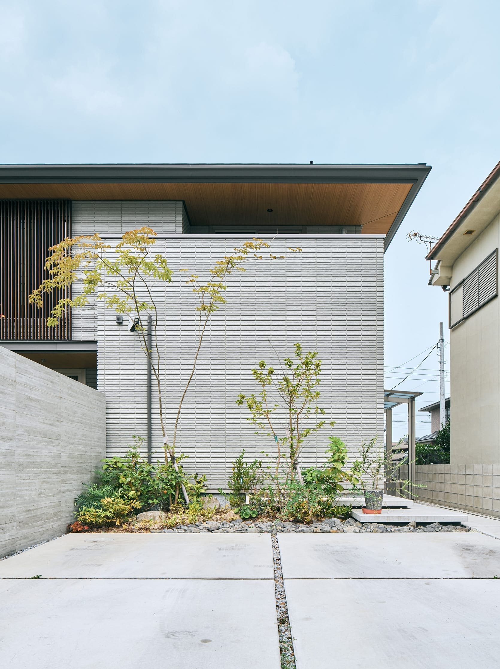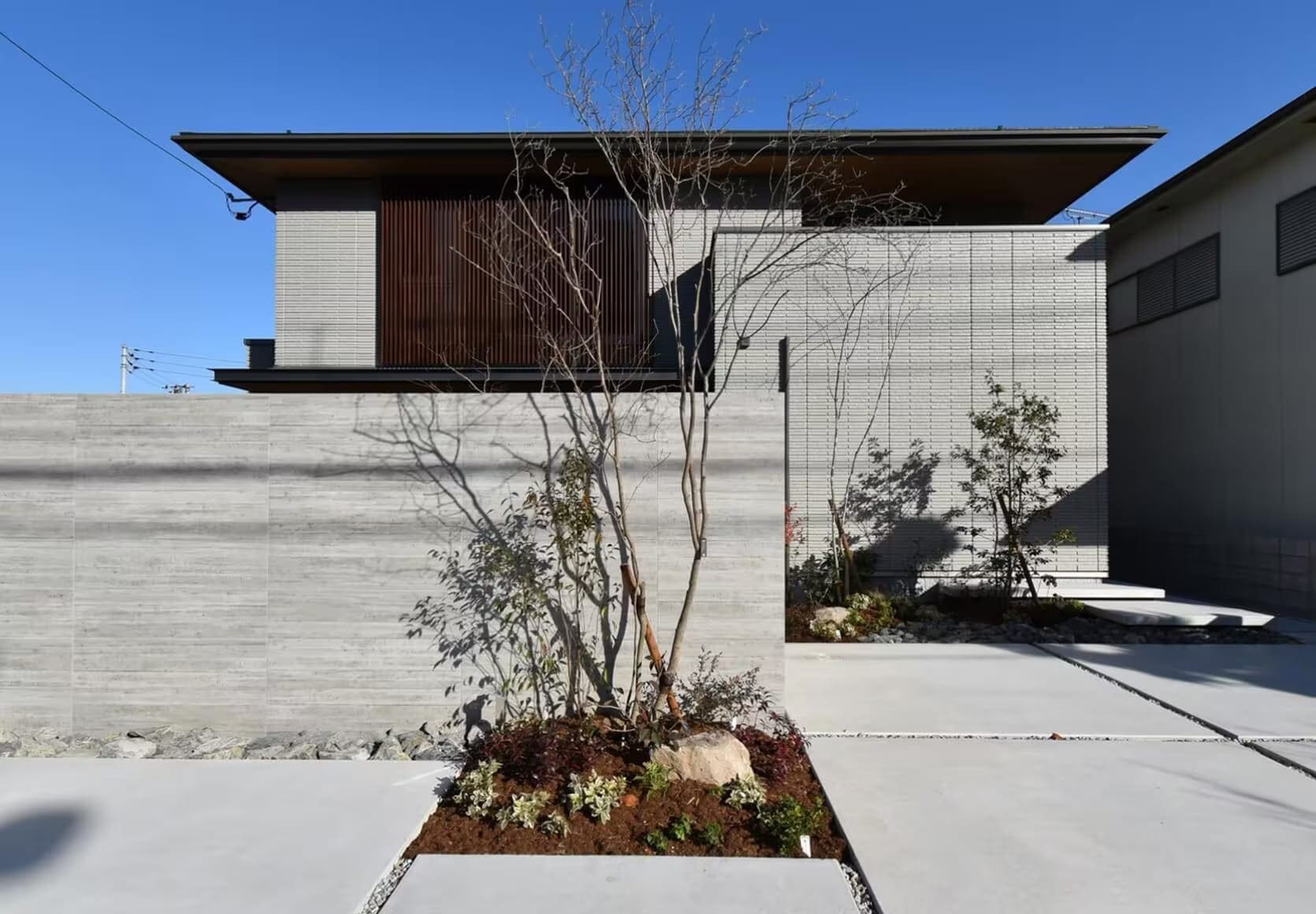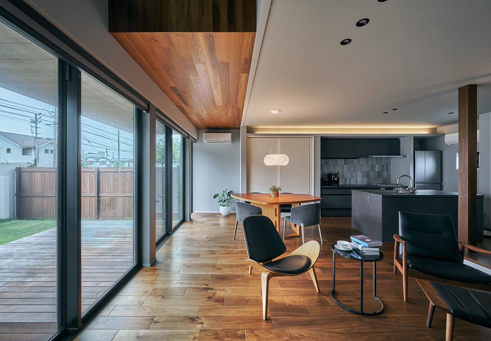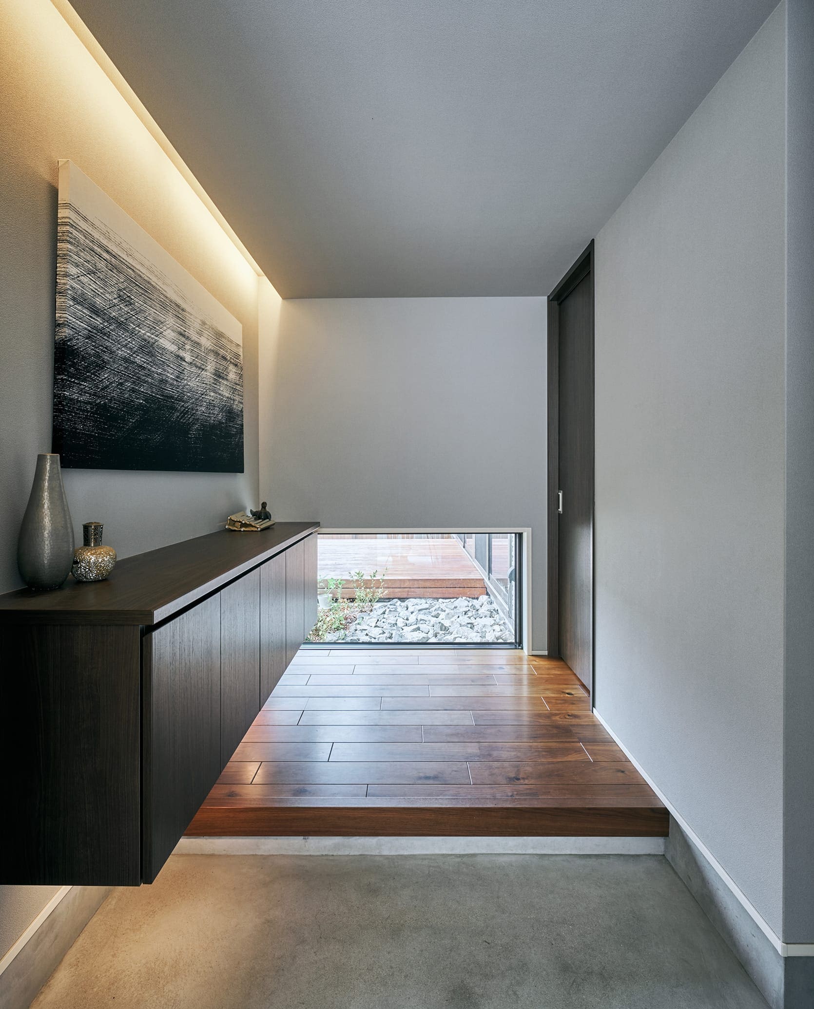 美しさと遊び心を追求した邸宅。グランドピアノのためのステージがあるリビング。そのステージから2階へとつながる書斎スペースを一体空間として考えたプランです。抑えた光が差す南側吹抜は上下階を緩やかに結び、ご家族のつながりをいつも感じられる優しい空間に。内観はグレーの壁面を基調に、黒い格子や濃い茶の床、外部の緑とも調和。外観の色調も合わせ、品のあるすっきりとした佇まいをめざしました。