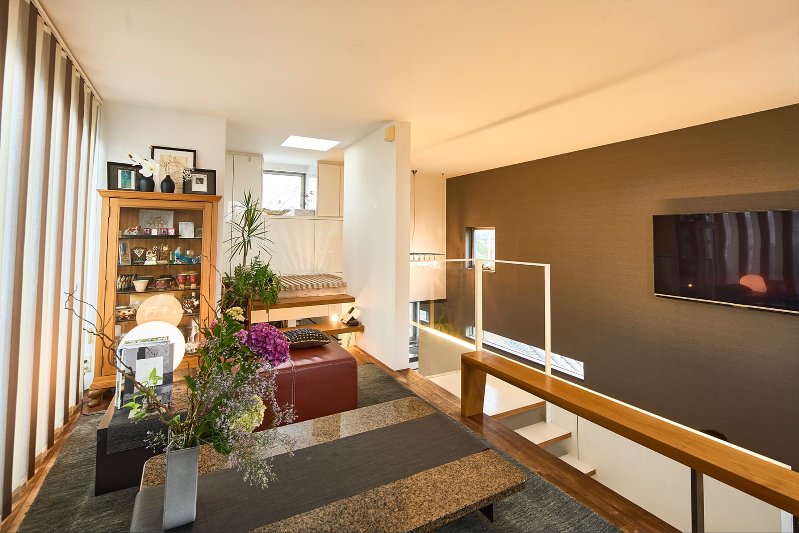 「部屋数は必要ない、家族で過ごせる場所がほしい」という夫妻の希望は、さまざま用途に対応するフレキシブルな間取りとして実現した。その一例が、2階の壁付カウンターのあるスペースだ。「通路であり、食卓であり、時には妻のお花のレッスンの場にもなります。必要に応じてカタチを変えるカウンターは、私たちの希望を取り入れて設計してもらったものです」(旦那さま)。