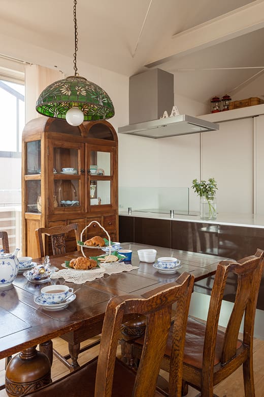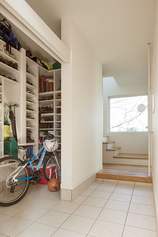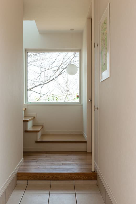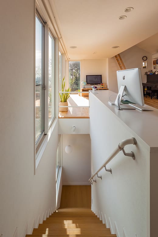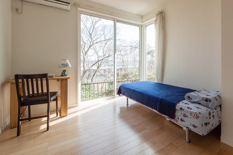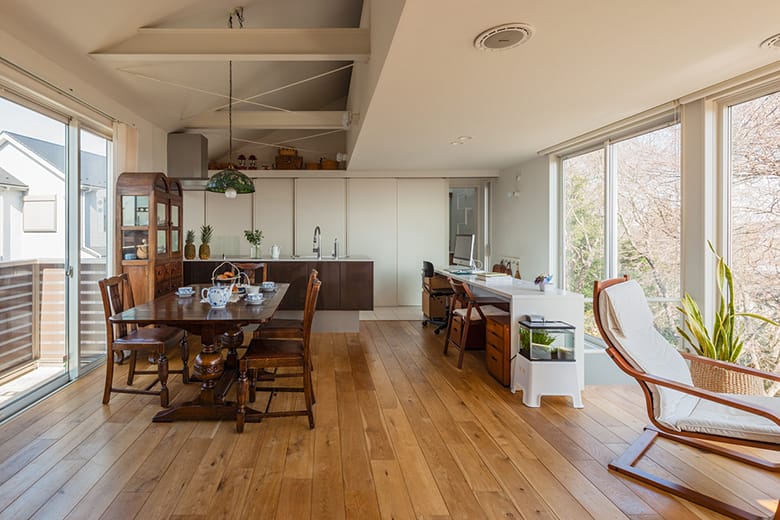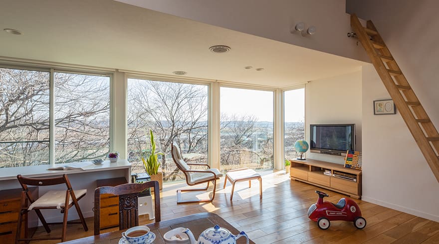 2階リビングの窓の外に広がる林や相模川の眺望は、約30坪とは思えない開放感。T様邸には、コンパクトな敷地で効率よく暮らせる工夫があります。たとえば、仕切りを少なくして空間を多目的に使用。LDKをワンルーム化し、勉強などができるお子様の居どころを設けたところ、家族一緒の時間も増えました。そして、17歳、13歳、6歳というお子様の年齢差を利用した空間の使い回し。幼少期は両親と川の字で眠り、宿題はダイニング横のカウンターで。学童期は主寝室から半独立した空間で勉強・就寝→受験期には個室へと、「家庭内引越し」をするというアイデアです。お子様の好奇心をくすぐるロフトやはしごもプラス。笑いが絶えない毎日です。