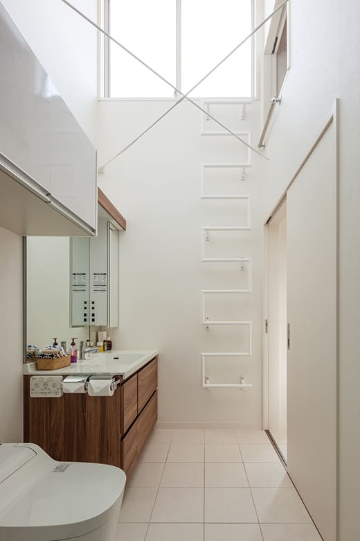 洗面室とトイレを一体化。正面のはしごでリビングに行ける仕掛けも